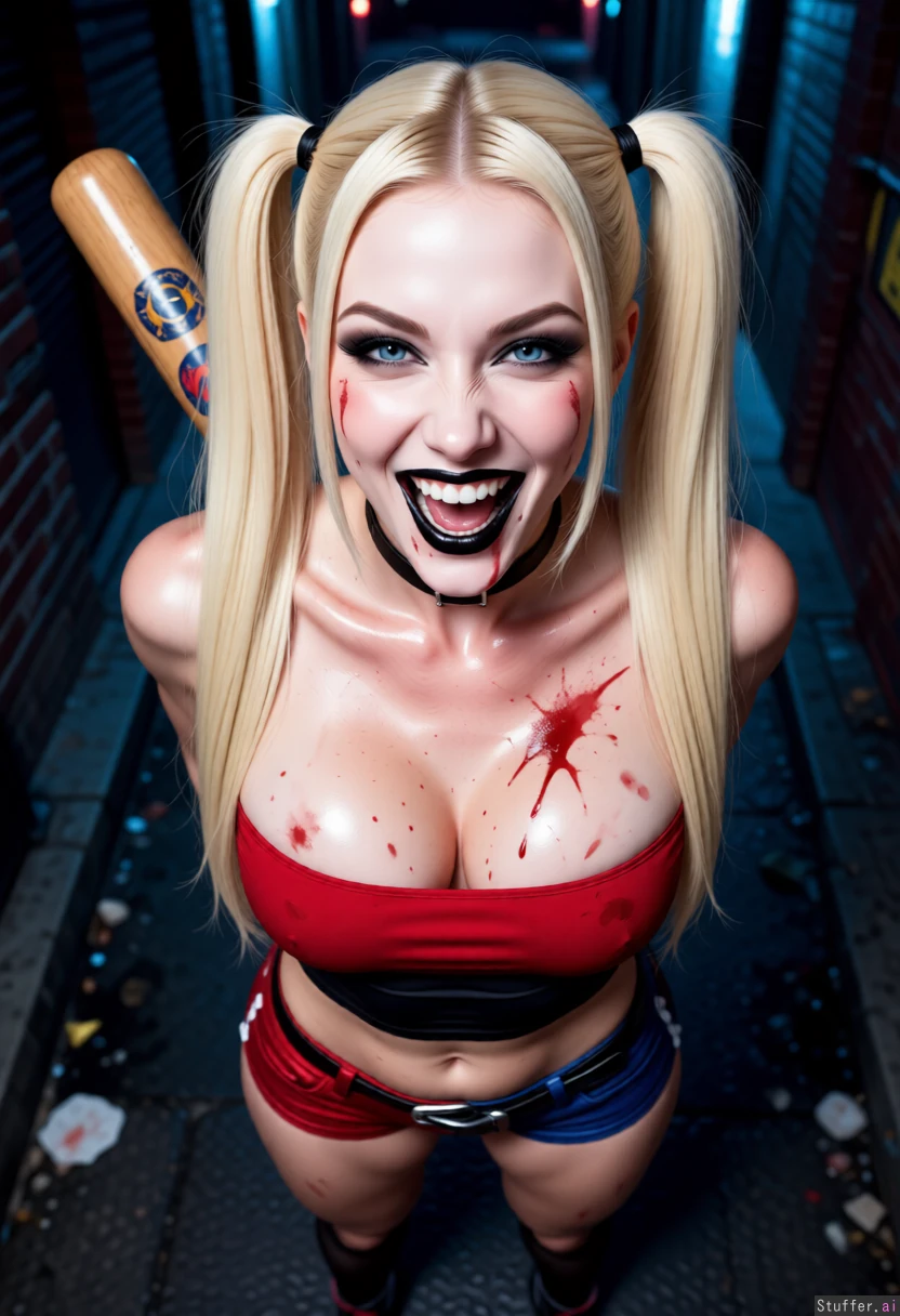 ((Ultra high quality)), (( realistic style)), ((realistic lighting)), rich colourful scheme, ((detailed skin)) 1 athletic woman, Harley Quinn, very long pigtails blonde hair, blue eyes, black eyeliner, rolling eyes, white skin, black lipstick, crazy eyes wide open Standing In a dark alley, crazy laughing , holding a baseball bat behind her back, wearing red and black tube top and booty shorts thin face, splattered with blood cleavage, deep navel, huge breast , wide hips, Viewed from above