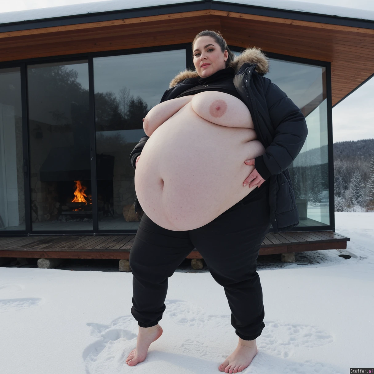 (A vintage portrait of subject walking casually under sun, snow effects, high contrast, cinematic set in Siberia style, emotional intensity), Extremely detailed ,(Middle aged hot milf, hot eyes,big_cheekbones,fat_lips,thick_eyebrows), (small tits,plump,bigass,fat arms, massive fat belly:1.1), (wearing winter outdoor casual clothing outfit ,fully clothed:1.3) ,(, looking desperately at viewer), (cinematic realistic universe:1.4),(feet, fullbody view :1.6), massive wooden modern glass house, fireplace, moody atmosphere, morning, river,( gigantic belly :1.6),.