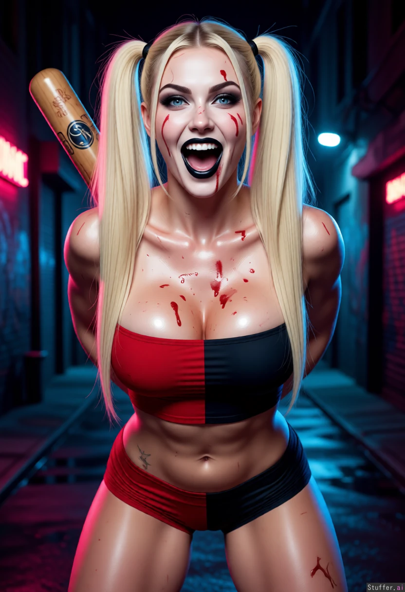 ((Ultra high quality)), (( realistic style)), ((realistic lighting)), rich colourful scheme, ((detailed skin)) 1 athletic woman, Harley Quinn, very long pigtails blonde hair, blue eyes, black eyeliner, rolling eyes, white skin, black lipstick, eyes wide open Standing In a dark alley, crazy laughing , holding a baseball bat behind her back, surprised wearing red and black tube top and booty shorts thin face, splattered with blood on her face cleavage, deep navel, huge breast , wide hips,