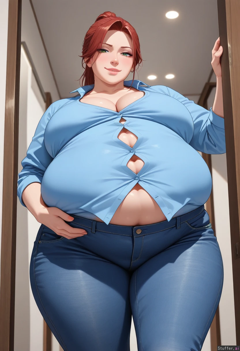 ((exquisite quality), (photorealistic), (masterpiece), (detailed realistic face), (skin detail), (detailed realistic anime style), (solo), (one girl), (low angle:1.0)), ((Beautiful girl_next_door), (standing in the doorway), (long red hair in a ponytail), (green eyes), (seductive expression), (seductive eyes), (seductive smirk), (milf)), ((Wearing a button-down blue shirt), (denim jeans), (cleavage), (unbuttoned jeans), (button gaps), (straining tight), (pressure on shirt), (too tight), (too fat), (belly spilling through the gaps), (fully dressed), (fully buttoned), (covered belly), (slut), (erotic), (slutty makeup), (pink lips), (eyeshadow), (eyeliner), (mascara), (aquiline nose)), ((Overweight:1.5), (big belly:1.6), (squishy waist), (obese waist), (love handles))