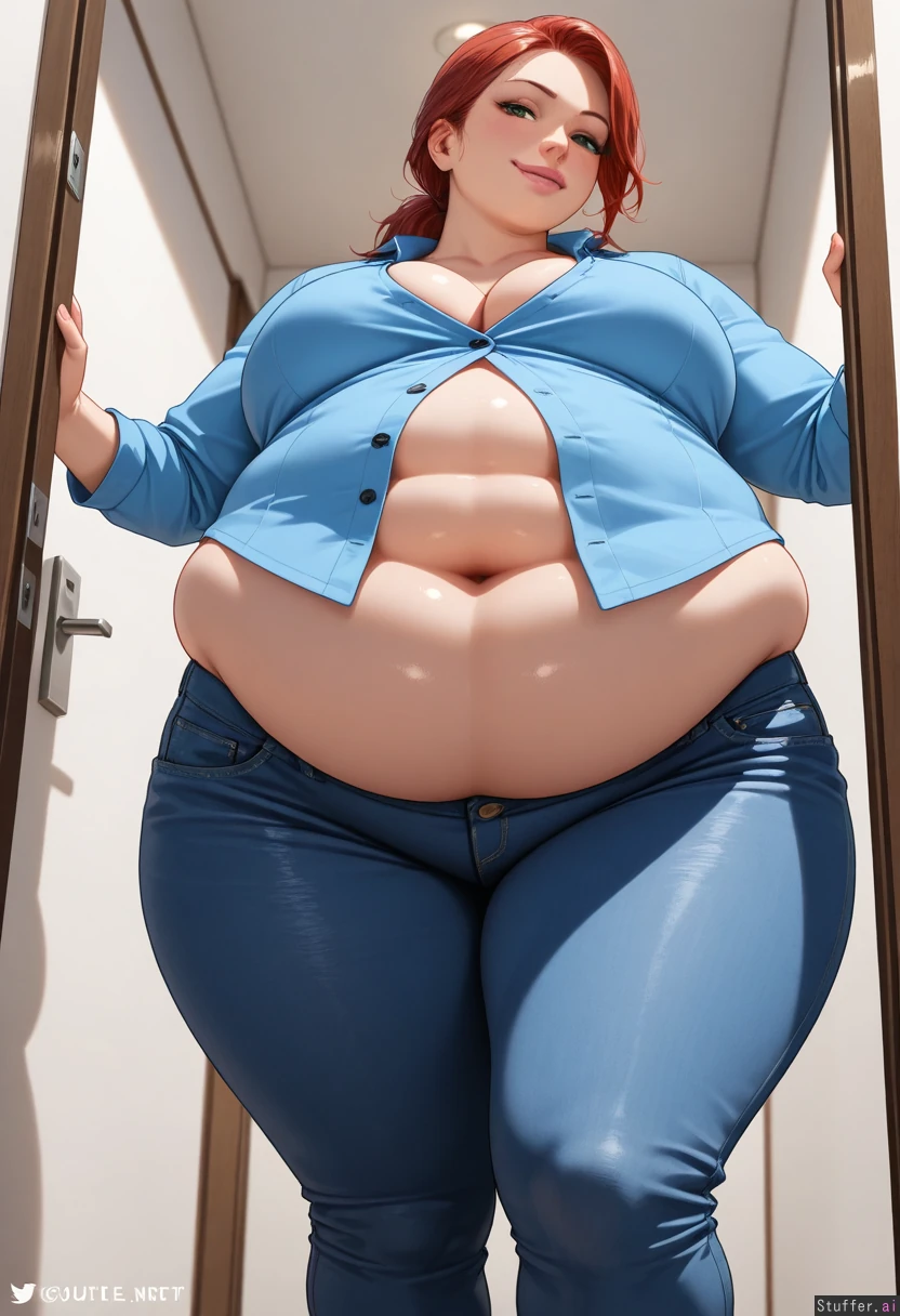 ((exquisite quality), (photorealistic), (masterpiece), (detailed realistic face), (skin detail), (detailed realistic anime style), (solo), (one girl), (low angle:1.0)), ((Beautiful girl_next_door), (standing in the doorway), (long red hair in a ponytail), (green eyes), (seductive expression), (seductive eyes), (seductive smirk), (milf), (slut), (erotic), (slutty makeup), (pink lips), (eyeshadow), (eyeliner), (mascara), (aquiline nose)), ((Wearing a button-down blue shirt), (denim jeans), (cleavage), (button gaps), (several buttons), (straining tight), (buttons straining), (pressure on shirt), (too tight), (too fat), (belly spilling through the gaps), (fully dressed), (fully buttoned), (covered belly)), ((Overweight:1.5), (big belly:1.6), (squishy waist), (obese waist), (love handles), (belly fat spilling between buttons))