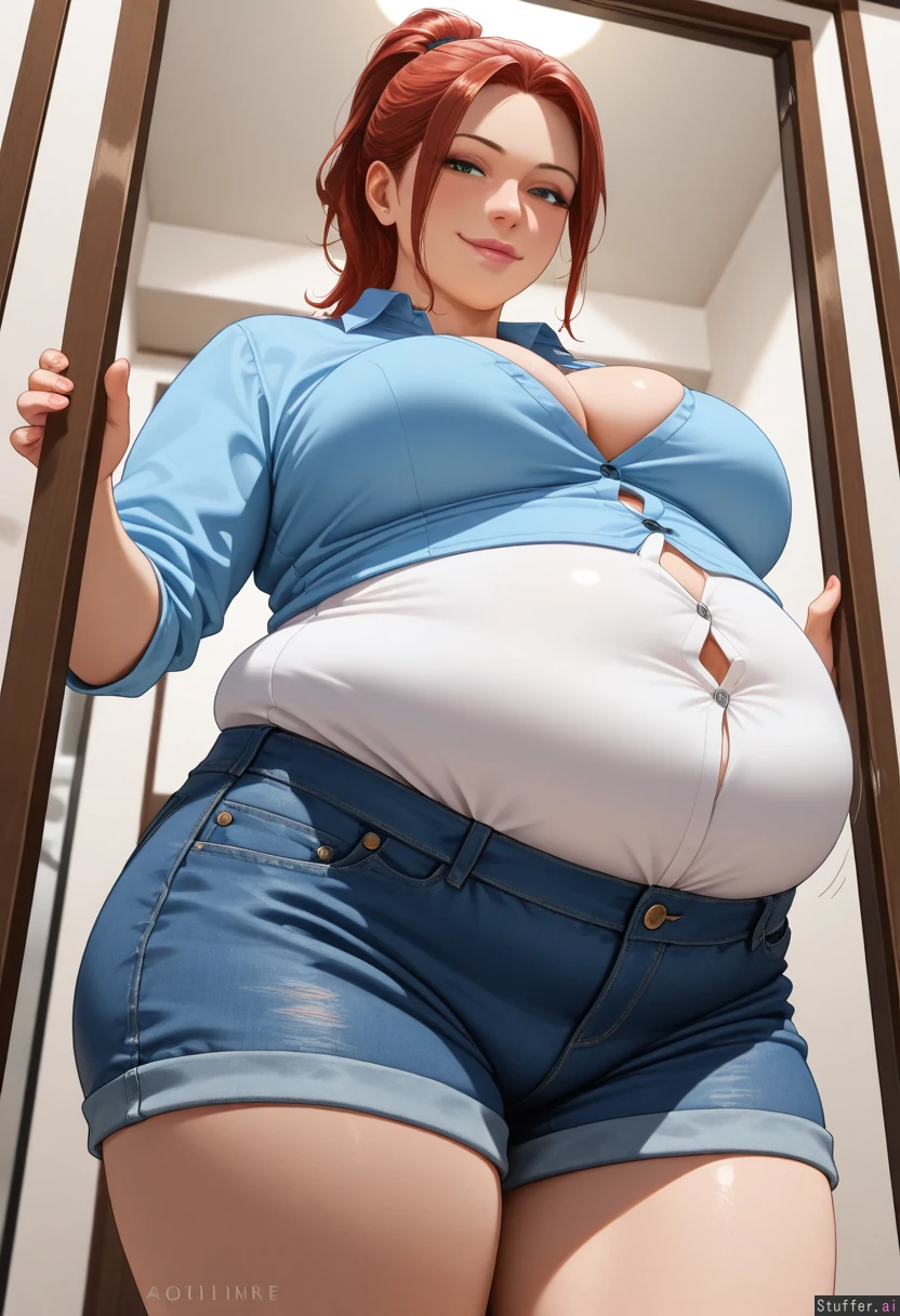 ((exquisite quality), (photorealistic:1.8), (masterpiece), (detailed realistic face), (skin detail), (detailed realistic style), (solo), (one girl), (low angle:1.0), (detailed realistic body)), ((Beautiful girl_next_door), (standing in the doorway), (long red hair in a ponytail), (green eyes), (seductive expression), (seductive eyes), (seductive smirk), (milf), (slut), (erotic), (slutty makeup), (pink lips), (eyeshadow), (eyeliner), (mascara), (aquiline nose)), ((Wearing a button-down sheer blue shirt), (denim shorts), (cleavage), (button gaps), (several buttons), (straining tight), (buttons straining), (pressure on shirt), (too tight), (too fat), (belly spilling through the gaps), (fully dressed), (fully buttoned), (covered belly)), ((Overweight:1.5), (big belly:1.4), (squishy waist), (love handles))