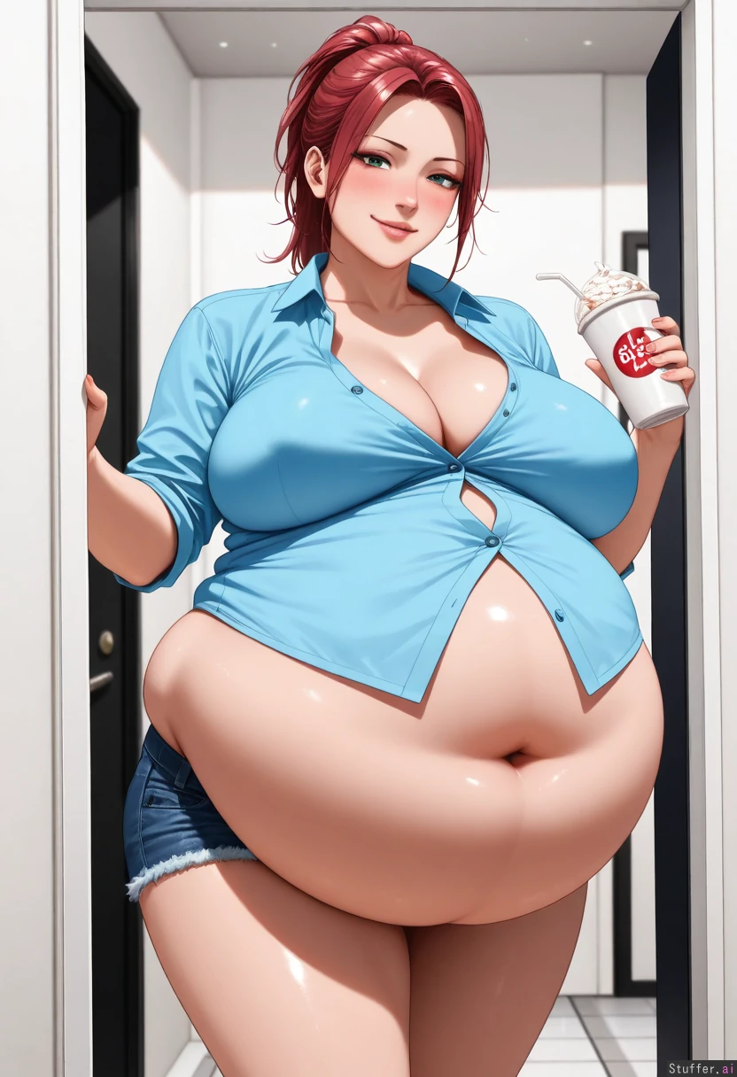 ((exquisite quality), (photorealistic:1.8), (masterpiece), (detailed realistic face), (skin detail), (detailed realistic style), (solo), (one girl), (low angle:1.0), (detailed realistic body)), ((Beautiful girl_next_door), (standing in the doorway), (long red hair in a ponytail), (green eyes), (seductive expression), (seductive eyes), (seductive smirk), (milf), (slut), (erotic:1.8), (slutty makeup), (pink lips), (eyeshadow), (eyeliner), (mascara), (aquiline nose), (blush), (temptress), (drinking a milkshake), (sensual pose)), ((Wearing a button-down sheer blue shirt), (denim shorts), (cleavage), (button gaps), (several buttons), (straining tight), (buttons straining), (pressure on shirt), (too tight), (too fat), (belly spilling through the gaps), (fully dressed), (fully buttoned), (covered belly)), ((Overweight:1.7), (big belly:1.8), (squishy waist), (love handles), (big boobs), (feedism), (weight gain kink), (fat belly kink))