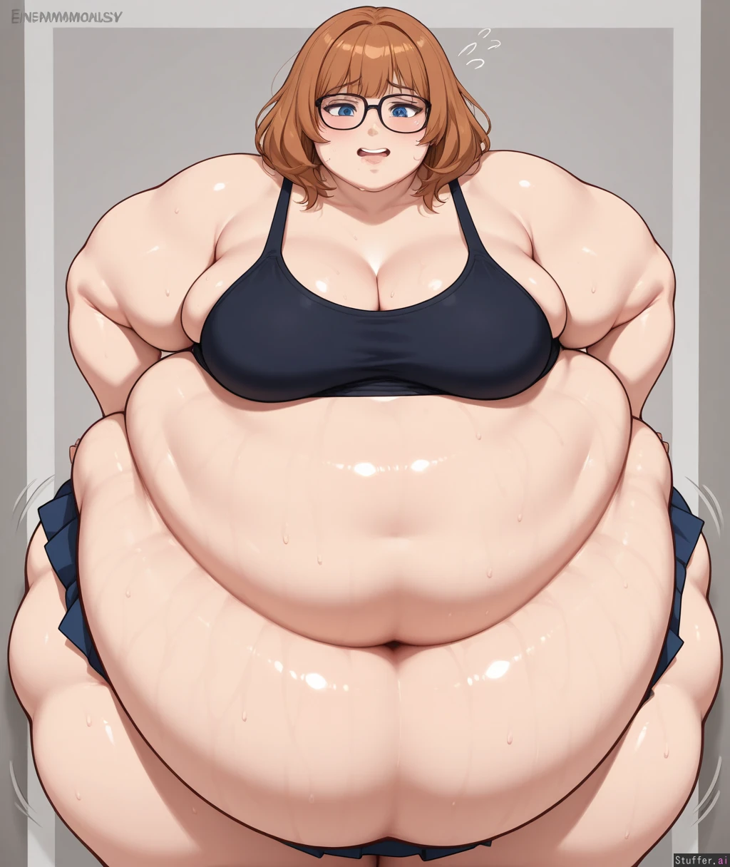 flat color, shading, (kittew(artist):0.5), (blushyspicy(artist):0.3), solo, (enormously morbidly obese girl:2.0),sweaty, standing, leaning forward (Massive jiggly belly:1.3), (small breasts), chubby arms, love handles, thick thighs, wide hips, fat face, double chin, fat rolls, immobile girl, ((mouth open, heavy)), (exposed belly), tank top, skirt, seductress, cleavage, helpless, mouth breathing, blue eyes jiggle lines, stretch marks, struggling to walk, hands lifting the bottom of her belly, waddling, ((looking down at her body)), (1girl, solo),