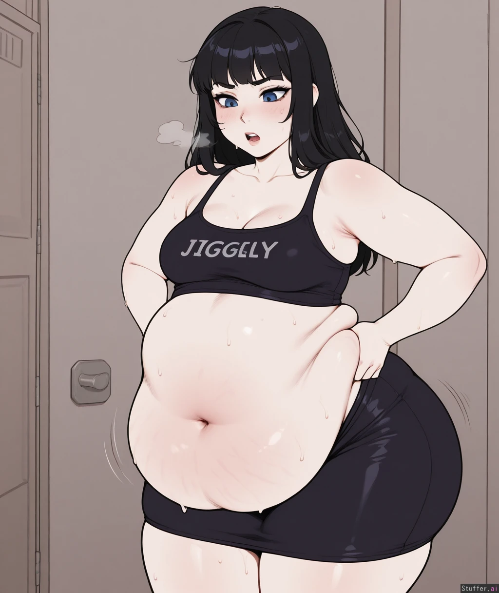flat color, shading, (kittew(artist):0.5), (blushyspicy(artist):0.3), solo, (fat goth girl),sweaty, standing, leaning forward (Massive jiggly belly:1.3), (small breasts), chubby arms, love handles, huge fat ass, huge fat thighs, wide hips, fat face, double chin, fat rolls, immobile girl, ((mouth open, heavy)), (exposed belly), tank top, tube skirt, seductress, cleavage, helpless, mouth breathing, blue eyes jiggle lines, stretch marks, struggling to walk, hands lifting the bottom of her belly, waddling, ((looking down at her body)), (1girl, solo),