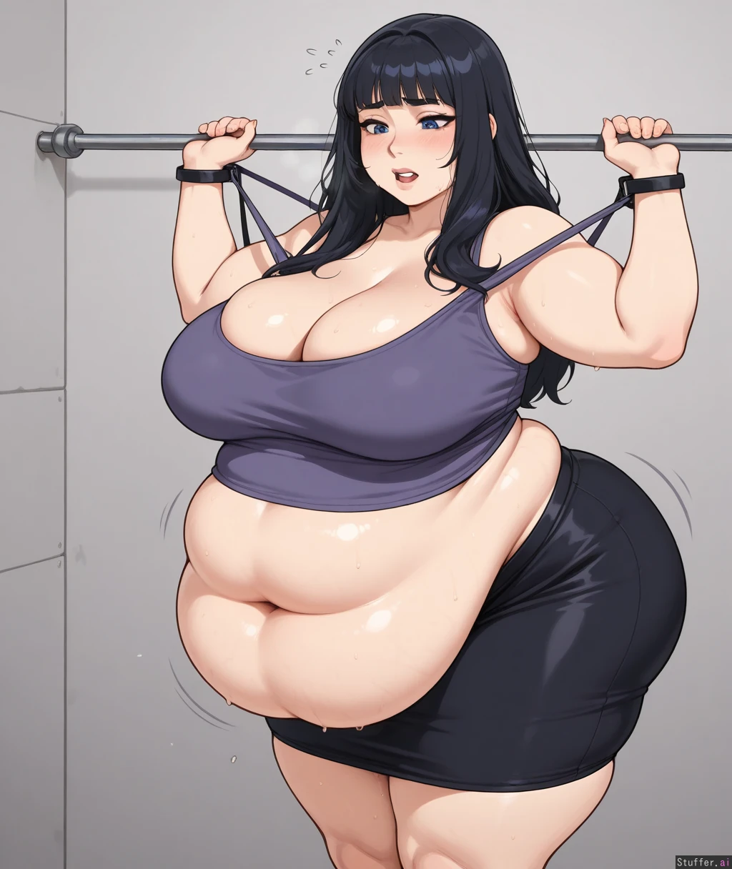 flat color, shading, (kittew(artist):0.5), (blushyspicy(artist):0.3), solo, (fat goth girl),sweaty, standing, leaning forward (sagging jiggly belly:1.3), chubby arms, love handles, huge fat ass, huge fat thighs, wide hips, fat face, double chin, fat rolls, immobile girl, ((mouth open, heavy)), (exposed belly), tank top, tube skirt, seductress, cleavage, helpless, mouth breathing, blue eyes jiggle lines, stretch marks, struggling to walk, hands lifting the bottom of her belly, waddling, ((looking down at her body)), (1girl, solo),