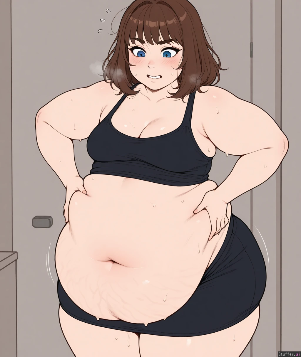 (flat color:1.3), shading, (kittew(artist):0.5), (blushyspicy(artist):0.3), solo, (obese goth girl),sweaty, standing, leaning forward (sagging belly), (small breasts), chubby arms, love handles, (huge fat ass, huge fat thighs), wide hips, fat face, double chin, fat rolls, immobile girl, ((mouth open, heavy)), (exposed belly), tank top, tube skirt, seductress, cleavage, helpless, mouth breathing, blue eyes jiggle lines, stretch marks, struggling to walk, hands lifting the bottom of her belly, waddling, ((looking down at her body)), (1girl, solo),