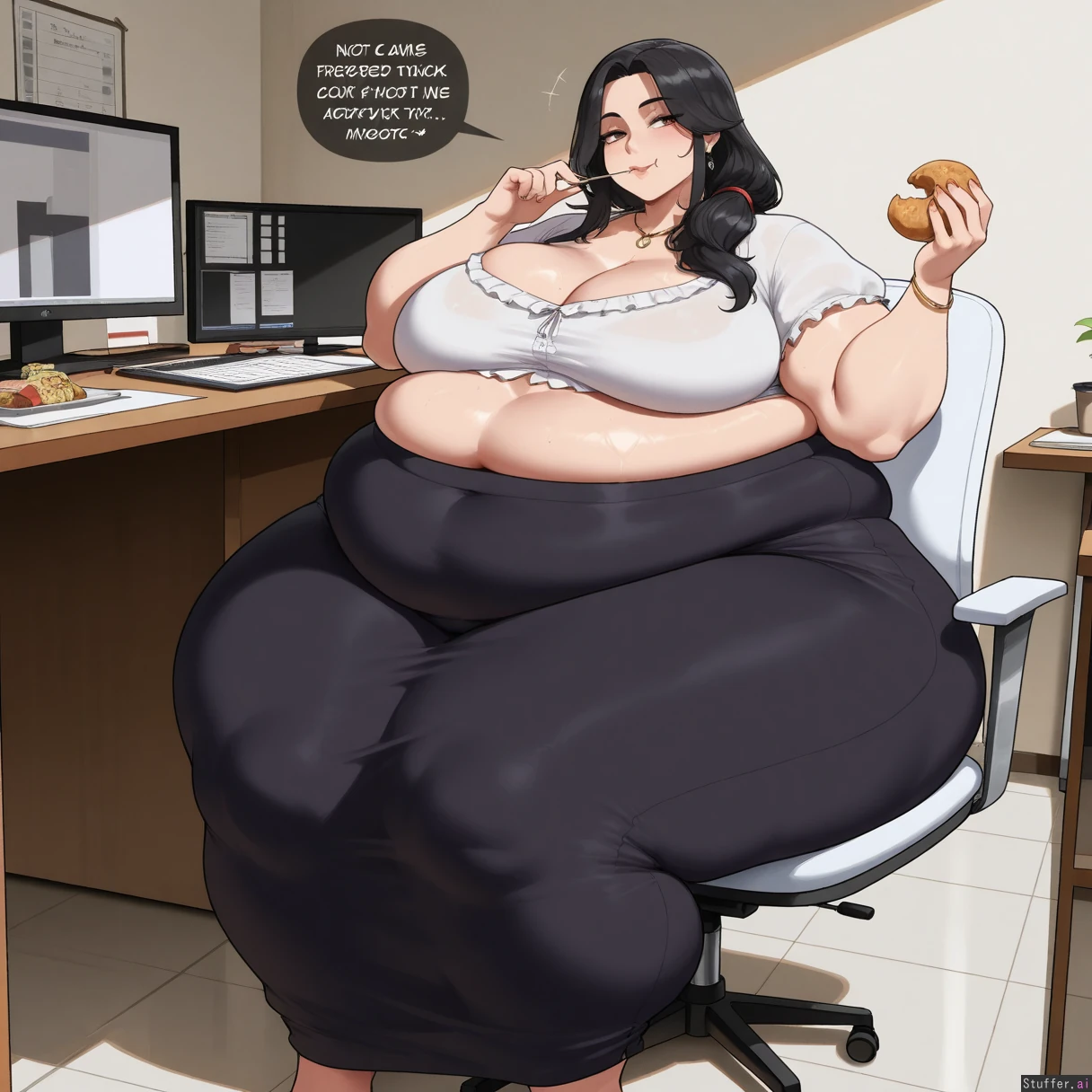 ((Solo, 1 woman)), ((nyantcha)))), (krekkov), c.cu(artist), araneesama(artist), 8k, high resolution, gorgeous, masterpiece, ((flawless)), (((high rating))), ((highly detailed face)), beautiful face, ((((fat female)))), ((((thick girl)))), (((steamy))), (((skindentation))), ((())), (((mature woman with long straight black hair))), ((((solo_female)))), ((hair tied back)), ((((Big breasts)))), ((())), ((Cleavage)), (((White blouse, black long skirt, jewelry)), ((fully clothed)), (((Morbidly obese:1.6))), ((big breasts)), ((massive thighs)), ((wide hips)), fat arms, ((bottom heavy)), ((voluptuous)), ((huge fat ass)), sweaty, (((Sexy, seductive))), (((((eating donuts))))), in office, looking at viewer, sitting,