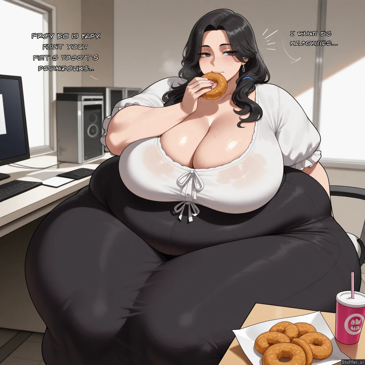 ((Solo, 1 woman)), ((nyantcha)))), (krekkov), c.cu(artist), araneesama(artist), 8k, high resolution, gorgeous, masterpiece, ((flawless)), (((high rating))), ((highly detailed face)), beautiful face, ((((fat female)))), ((((thick girl)))), (((steamy))), (((skindentation))), ((())), (((mature woman with long straight black hair))), ((((solo_female)))), ((hair tied back)), ((((Big breasts)))), ((())), ((Cleavage)), (((White blouse, black long skirt, jewelry)), ((fully clothed)), (((Morbidly obese:1.6))), ((big breasts)), ((massive thighs)), ((wide hips)), fat arms, ((bottom heavy)), ((voluptuous)), ((huge fat ass)), sweaty, (((Sexy, seductive))), (((((eating donuts))))), in office, looking at viewer, sitting,