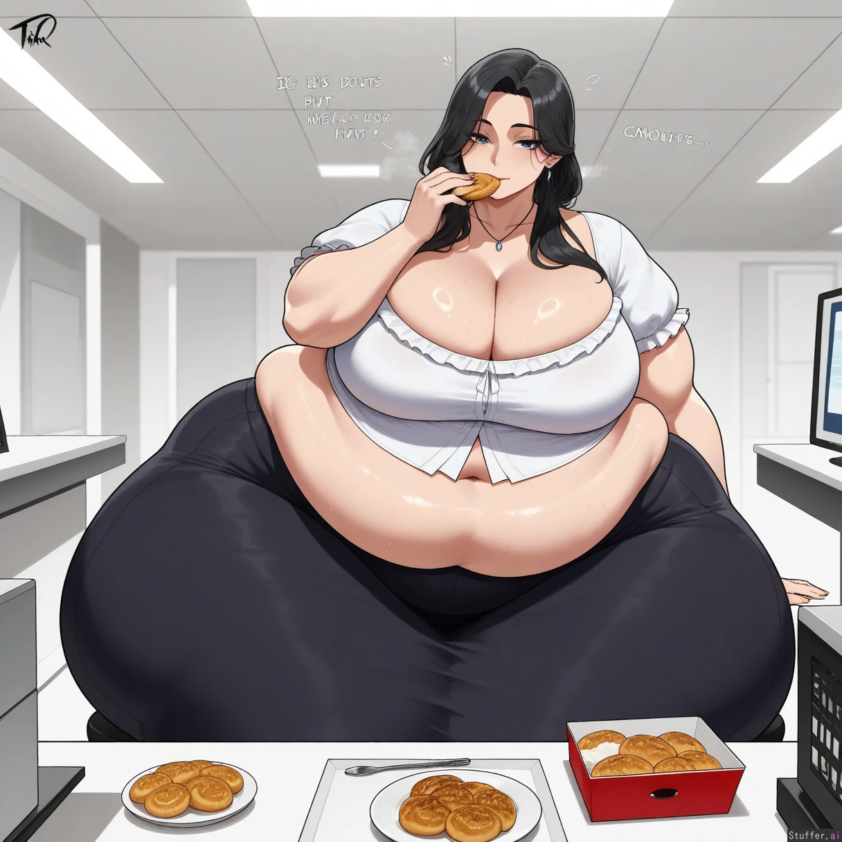 ((Solo, 1 woman)), ((nyantcha)))), (krekkov), c.cu(artist), araneesama(artist), 8k, high resolution, gorgeous, masterpiece, ((flawless)), (((high rating))), ((highly detailed face)), beautiful face, ((((fat female)))), ((((thick girl)))), (((steamy))), (((skindentation))), ((())), (((mature woman with long straight black hair))), ((((solo_female)))), ((hair tied back)), ((((Big breasts)))), ((())), ((Cleavage)), (((White blouse, black long skirt, jewelry)), ((fully clothed)), (((Morbidly obese:1.6))), ((big breasts)), ((massive thighs)), ((wide hips)), fat arms, ((bottom heavy)), ((voluptuous)), ((huge fat ass)), sweaty, (((Sexy, seductive))), (((((eating donuts))))), in office, looking at viewer, sitting,