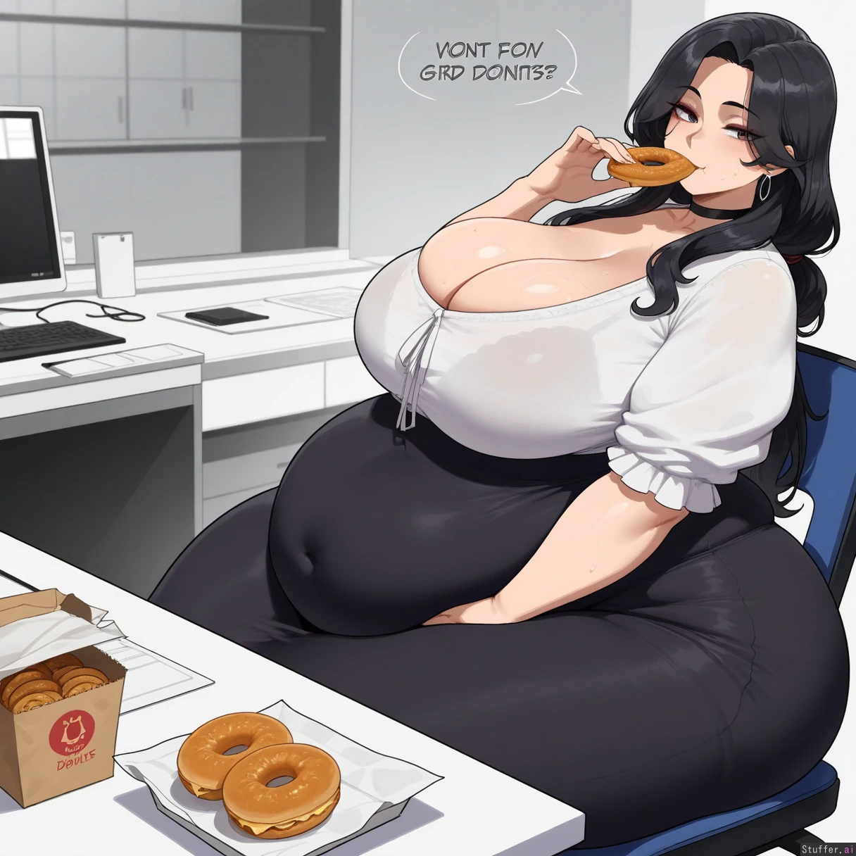 ((Solo, 1 woman)), ((nyantcha)))), (krekkov), c.cu(artist), araneesama(artist), 8k, high resolution, gorgeous, masterpiece, ((flawless)), (((high rating))), ((highly detailed face)), beautiful face, ((((fat female)))), ((((thick girl)))), (((steamy))), (((skindentation))), ((())), (((mature woman with long straight black hair))), ((((solo_female)))), ((hair tied back)), ((((Big breasts)))), ((())), ((Cleavage)), (((White blouse, black long skirt, jewelry)), ((fully clothed)), (((Morbidly obese:1.4))), ((big breasts)), ((massive thighs)), ((wide hips)), fat arms, ((bottom heavy)), ((voluptuous)), ((huge fat ass)), sweaty, (((Sexy, seductive))), (((((eating donuts))))), in office, looking at viewer, sitting,