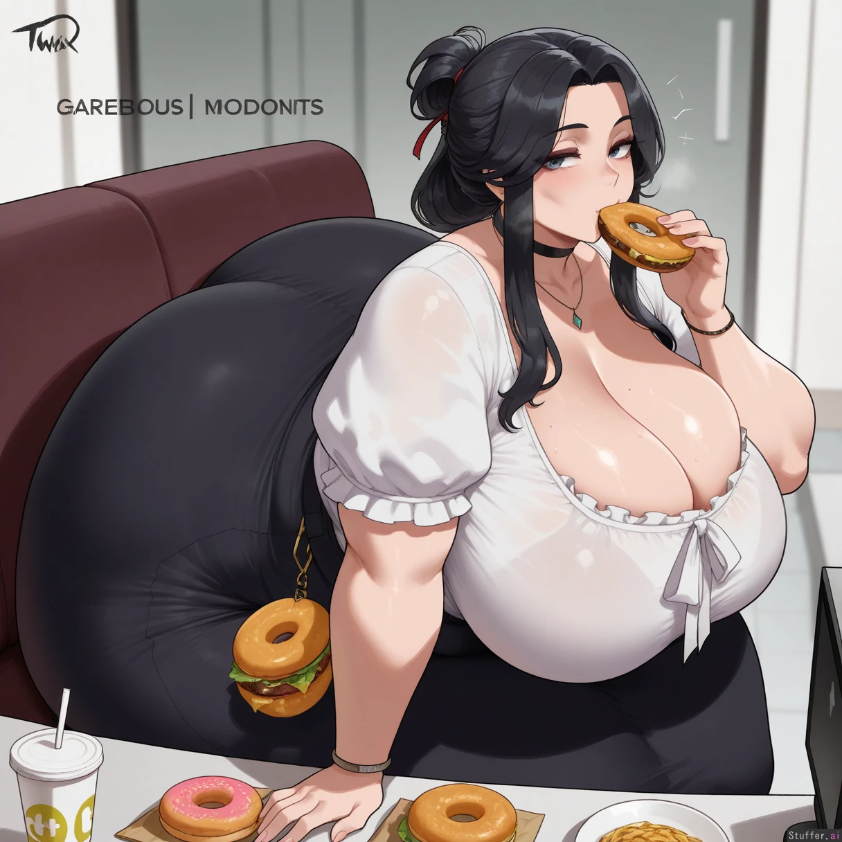 ((Solo, 1 woman)), ((nyantcha)))), (krekkov), c.cu(artist), araneesama(artist), 8k, high resolution, gorgeous, masterpiece, ((flawless)), (((high rating))), ((highly detailed face)), beautiful face, ((((fat female)))), ((((thick girl)))), (((steamy))), (((skindentation))), ((())), (((mature woman with long straight black hair))), ((((solo_female)))), ((hair tied back)), ((((Big breasts)))), ((())), ((Cleavage)), (((White blouse, black long skirt, jewelry)), ((fully clothed)), (((Morbidly obese:1.4))), ((big breasts)), ((massive thighs)), ((wide hips)), fat arms, ((bottom heavy)), ((voluptuous)), ((gigantic fat ass)), sweaty, (((Sexy, seductive))), (((((eating donuts))))), in office, looking at viewer, sitting,