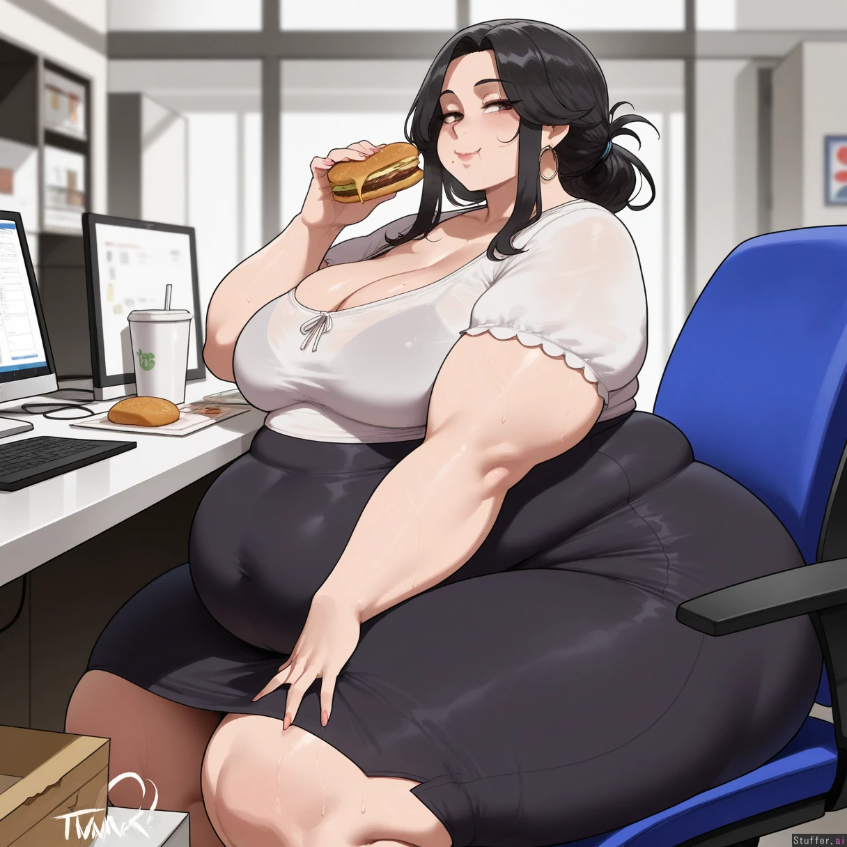 ((Solo, 1 woman)), ((nyantcha)))), (krekkov), c.cu(artist), araneesama(artist), 8k, high resolution, gorgeous, masterpiece, ((flawless)), (((high rating))), ((highly detailed face)), beautiful face, ((((fat female)))), ((((thick girl)))), (((steamy))), (((skindentation))), ((())), (((mature woman with long straight black hair))), ((((solo_female)))), ((hair tied back)), ((((Big breasts)))), ((())), ((Cleavage)), (((White blouse, black long skirt, jewelry)), ((fully clothed)), (((Morbidly obese:1.4))), fat belly, ((medium breasts)), ((massive thighs)), ((wide hips)), fat arms, ((bottom heavy)), ((voluptuous)), ((gigantic fat ass)), sweaty, (((Sexy, seductive))), (((((eating donuts))))), in office, looking at viewer, sitting,