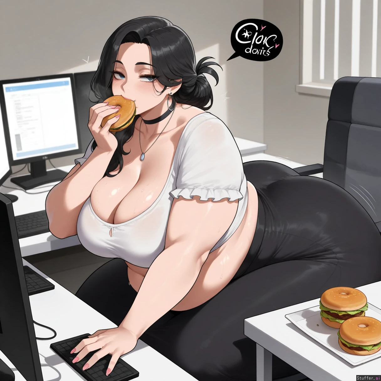 ((Solo, 1 woman)), ((nyantcha)))), (krekkov), c.cu(artist), araneesama(artist), 8k, high resolution, gorgeous, masterpiece, ((flawless)), (((high rating))), ((highly detailed face)), beautiful face, ((((fat female)))), ((((thick girl)))), (((steamy))), (((skindentation))), ((())), (((mature woman with long straight black hair))), ((((solo_female)))), ((hair tied back)), ((((Big breasts)))), ((())), ((Cleavage)), (((White blouse, black long skirt, jewelry)), ((fully clothed)), (((Morbidly obese:1.4))), fat belly, ((medium breasts)), ((massive thighs)), ((wide hips)), fat arms, ((bottom heavy)), ((voluptuous)), ((gigantic fat ass)), sweaty, (((Sexy, seductive))), (((((eating donuts))))), in office, looking at viewer, sitting,