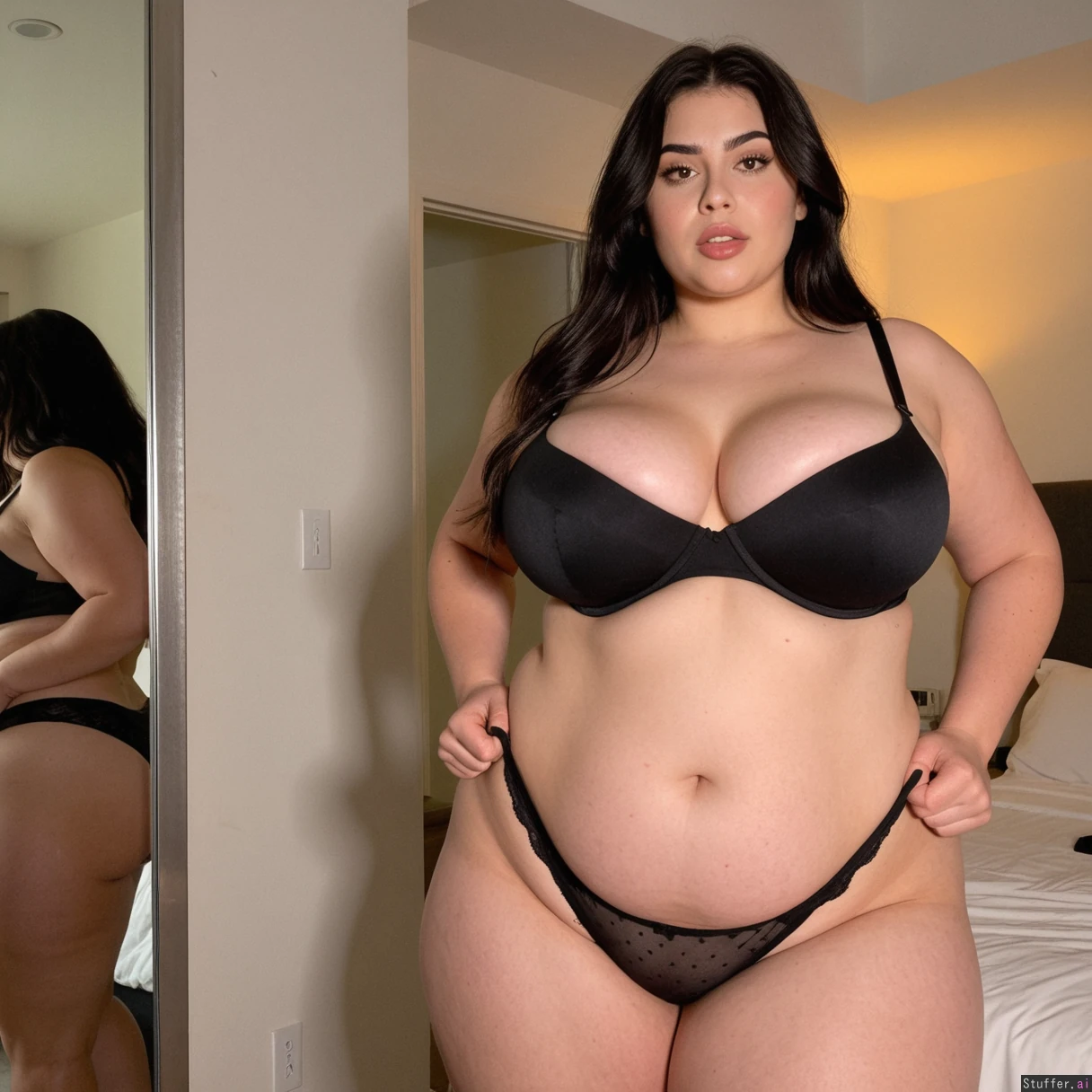 Supermodel influencer, eager flirty facial expression, gorgeous 28 year old (hyper busty chilean), front view, reflective skin, gorgeous face, tousled dark hair, (very heavy fat thick flared thighs), (extremely gigantice, mega-fat, ultra wide, colossally flared hips), lifelike, Beautiful lighting, intimate, hot, ((black bra), (black panties)), bedroom, standing, photoshoot, (((perfectly flat belly)))