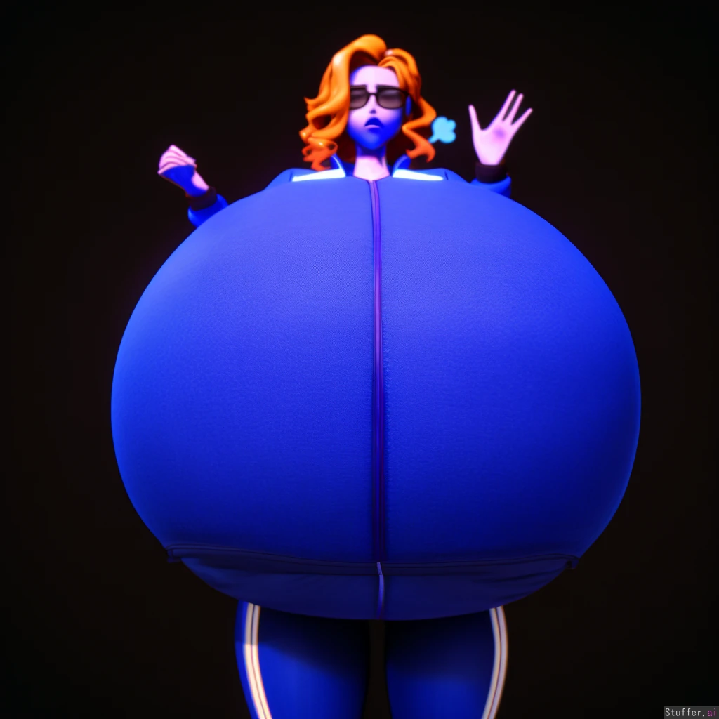 best quality, high rating, (((3D, 3D anime model, 3D character, highly detailed, flawless, perfect textures, vrchat))), anime eyes, orange wavy hair, solo, blueberry inflation, dark blueberry colored skin, human, chewing, spherical inflation, uncomfortably full, dazed, neon candy factory lab, huge round breasts, dome shaped breasts, neutral blue track suit