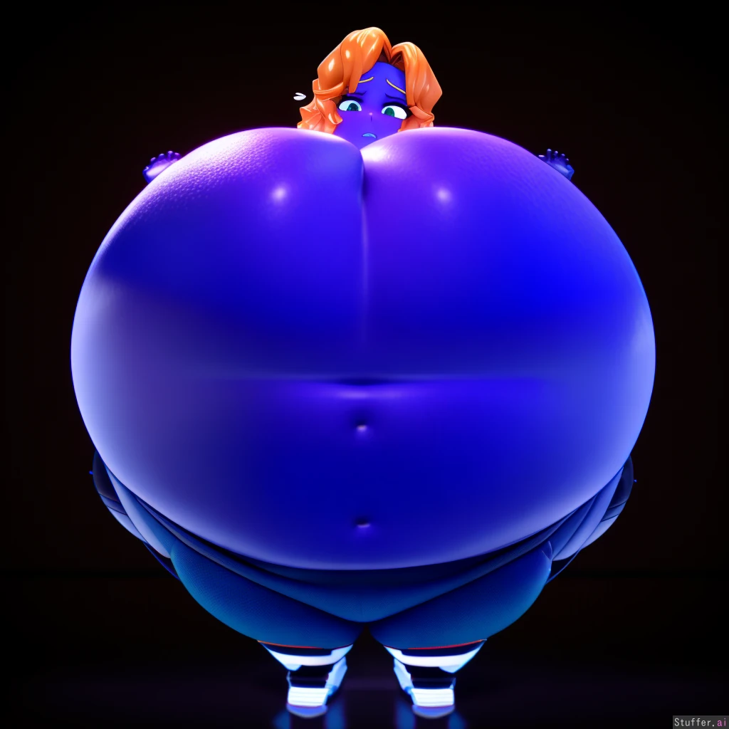 best quality, high rating, (((3D, 3D anime model, 3D character, highly detailed, flawless, perfect textures, vrchat))), anime eyes, orange wavy hair, solo, blueberry inflation, dark blueberry colored skin, human, chewing, (((spherical inflation))), uncomfortably full, dazed, neon candy factory lab, huge round breasts, dome shaped breasts, neutral blue track suit, sunken limbs, concerned, worried