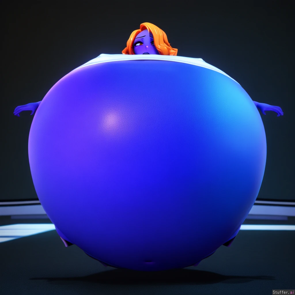 best quality, high rating, (((3D, 3D anime model, 3D character, highly detailed, flawless, perfect textures, vrchat))), anime eyes, futa, orange wavy hair, solo, blueberry inflation, dark blueberry colored skin, human, chewing, (((spherical inflation))), uncomfortably full, dazed, neon candy factory lab, huge round breasts, dome shaped breasts, neutral blue track suit, sunken limbs, concerned, worried, massive cock bulge, nipple outline