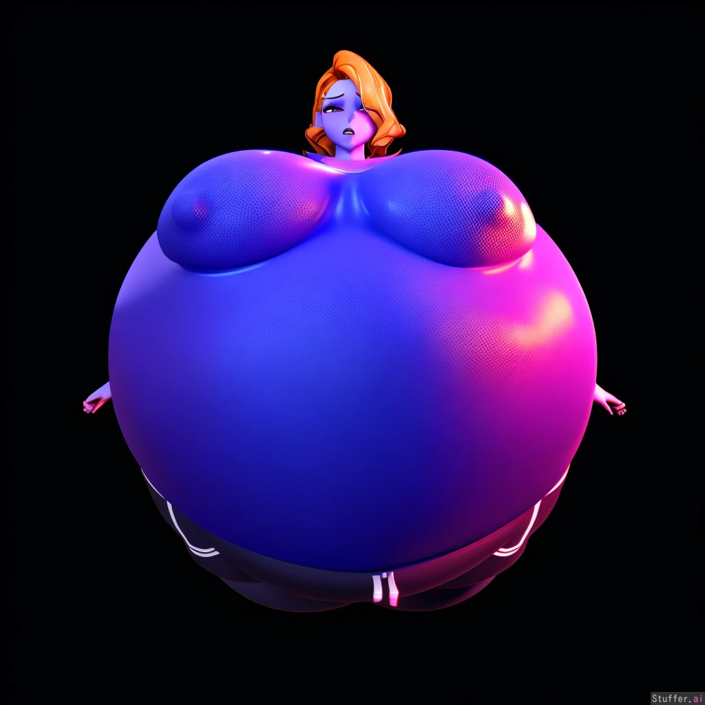 best quality, high rating, (((3D, 3D anime model, 3D character, highly detailed, flawless, perfect textures, vrchat))), anime eyes, futa, orange wavy hair, solo, blueberry inflation, dark blueberry colored skin, human, chewing, (((spherical inflation))), uncomfortably full, dazed, neon candy factory lab, huge round breasts, dome shaped breasts, neutral blue track suit, sunken limbs, concerned, worried, (((massive cock bulge))), nipple outline, view from above, looking up