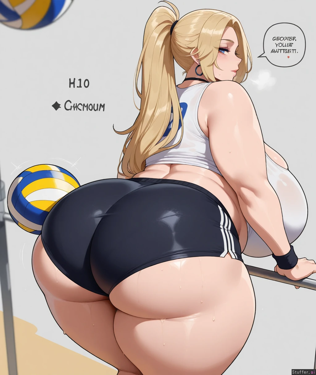 ((Solo, 1 woman)), ((nyantcha)))), (krekkov), c.cu(artist), araneesama(artist), 8k, high resolution, gorgeous, masterpiece, ((flawless)), (((high rating))), ((highly detailed face)), beautiful face, ((((fat female)))), ((((thick girl)))), (((steamy))), (((skindentation))), ((())), ((())), ((((solo_female)))), (()), ((((Volleyball player)))), (((long straight blonde hair tied back))), ((Cleavage)), (((White shirt, black shorts, jewelry)), (()), (((Morbidly obese:1.2))), ((big breasts)), ((massive thighs)), ((wide hips)), fat arms, ((voluptuous)), ((huge fat ass)), sweaty, (((Sexy, seductive))), ((((())))), on tropical beach, back view,