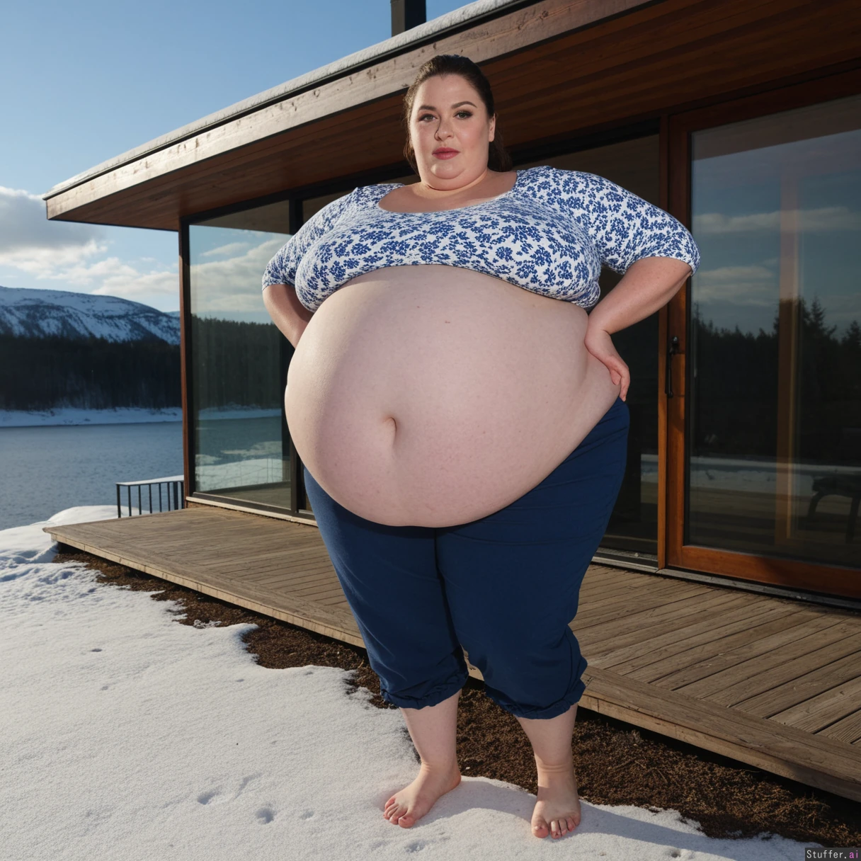 (A vintage portrait of subject walking casually under sun, snow effects, high contrast, cinematic set in Siberia style, emotional intensity), Extremely detailed ,(Middle aged hot milf, hot eyes,big_cheekbones,fat_lips,thick_eyebrows), (small tits,plump,bigass,fat arms, massive fat belly:1.1), (wearing summer outdoor casual clothing outfit ,fully clothed:1.3) ,(, looking desperately at viewer), (cinematic realistic universe:1.4),(feet, fullbody view :1.6), massive wooden modern glass house, fireplace, moody atmosphere, afternoon, lake,( gigantic belly :1.6),.