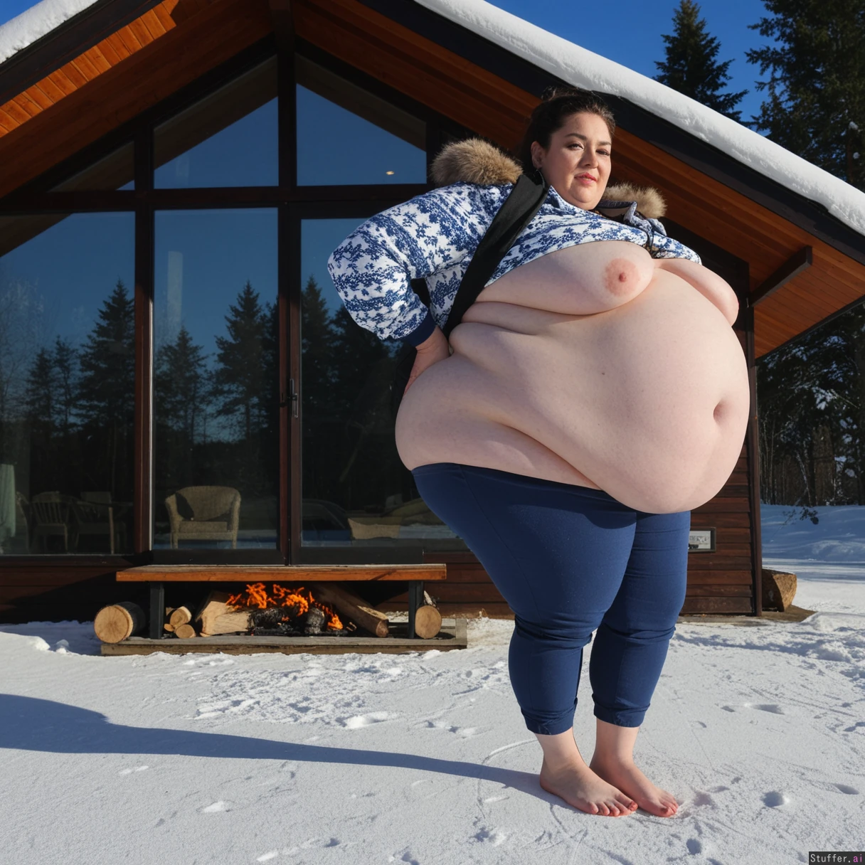 (A vintage portrait of subject walking casually under sun, snow effects, high contrast, cinematic set in Siberia style, emotional intensity), Extremely detailed ,(Middle aged hot milf, hot eyes,big_cheekbones,fat_lips,thick_eyebrows), (small tits,plump,bigass,fat arms, massive fat belly:1.1), (wearing Siberian outdoor casual clothing outfit ,fully clothed:1.3) ,(, looking desperately at viewer), (cinematic realistic universe:1.4),(feet, fullbody view :1.6), massive wooden modern glass house, fireplace, moody atmosphere, afternoon, lake,( gigantic belly :1.6),.