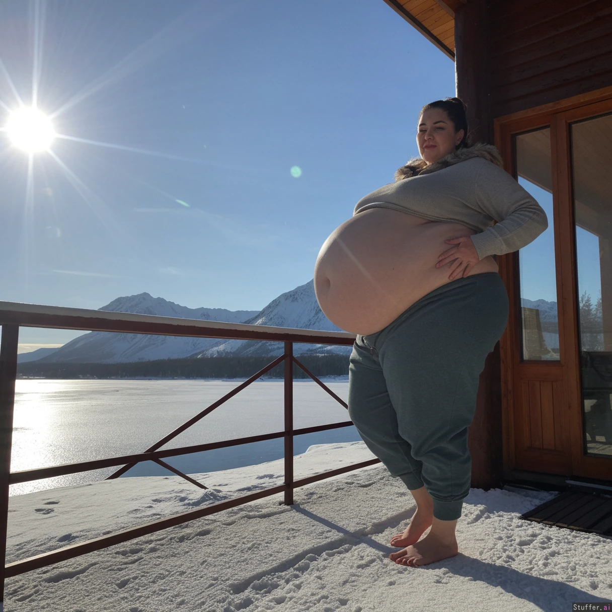 (A vintage portrait of subject walking casually under sun, snow effects, high contrast, cinematic set in Siberia style, emotional intensity), Extremely detailed ,(Middle aged hot milf, hot eyes,big_cheekbones,fat_lips,thick_eyebrows), (small tits,plump,bigass,fat arms, massive fat belly:1.1), ,(, looking desperately at viewer), (cinematic realistic universe:1.4),(feet, fullbody view :1.6), massive wooden modern glass house, fireplace, moody atmosphere, afternoon, lake,( gigantic belly :1.6),(wearing Siberian outdoor casual clothing outfit ,fully clothed:1.3).