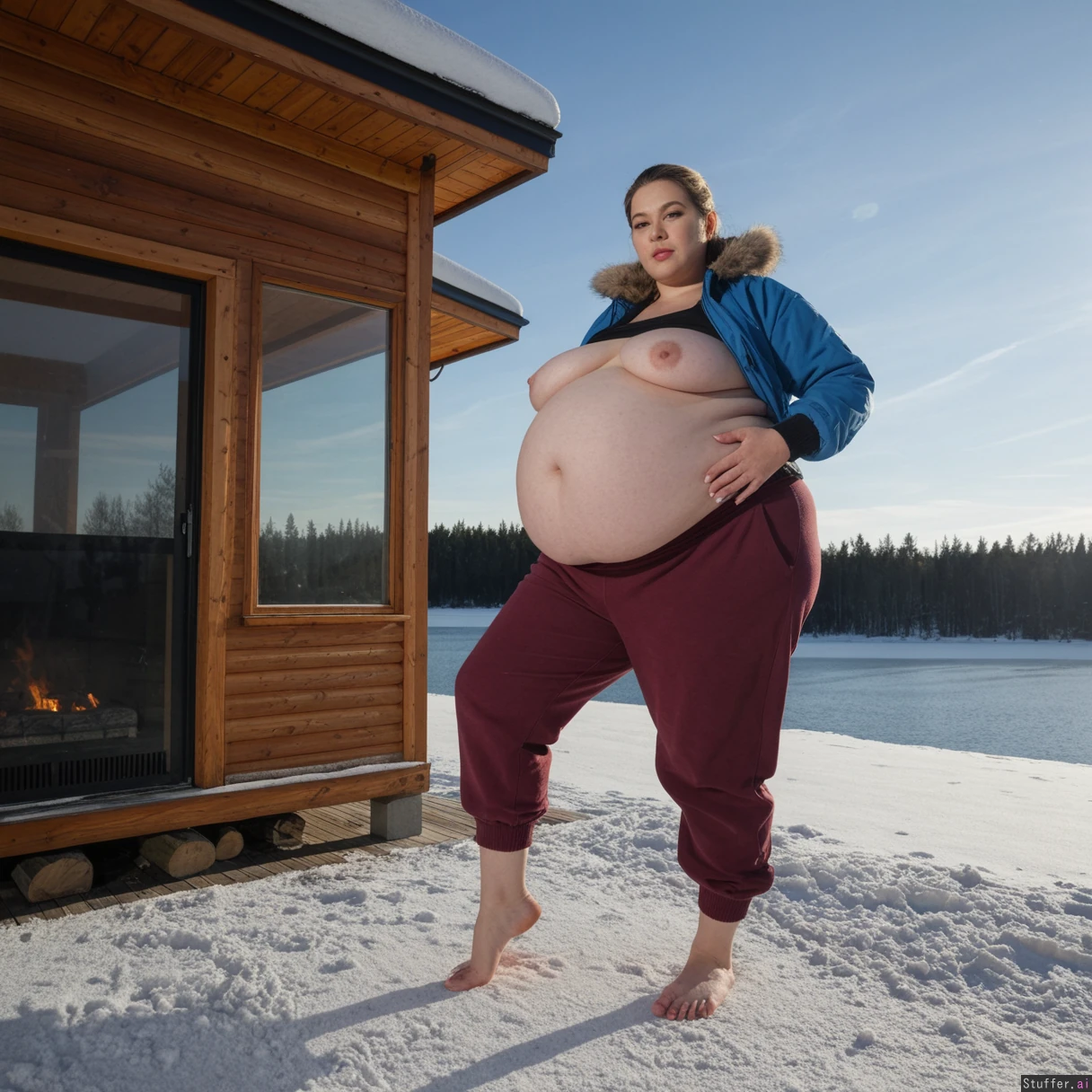 (A vintage portrait of subject walking casually under sun, snow effects, high contrast, cinematic set in Siberia style, emotional intensity), Extremely detailed ,(Middle aged hot milf, hot eyes,big_cheekbones,fat_lips,thick_eyebrows), (small tits,plump,bigass,fat arms, massive fat belly:1.1), ,(, looking desperately at viewer), (cinematic realistic universe:1.4),(feet, fullbody view :1.6), massive wooden modern glass house, fireplace, moody atmosphere, afternoon, lake,( gigantic belly :1.6),(wearing Siberian outdoor casual clothing outfit ,fully clothed:1.3).