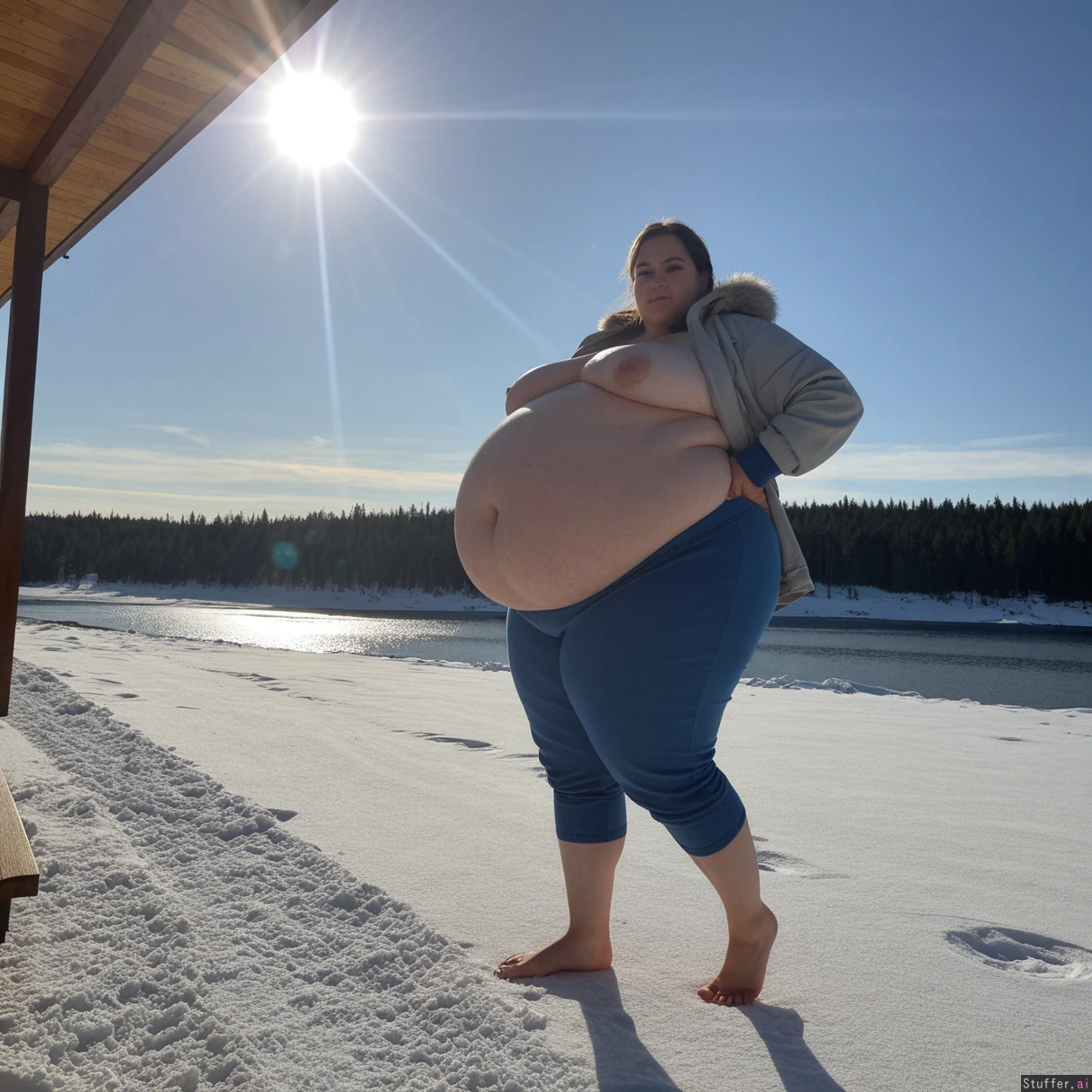 (A vintage portrait of subject walking casually under sun, snow effects, high contrast, cinematic set in Siberia style, emotional intensity), Extremely detailed ,(Middle aged hot milf, hot eyes,big_cheekbones,fat_lips,thick_eyebrows), (small tits,plump,bigass,fat arms, massive fat belly:1.1), ,(, looking desperately at viewer), (cinematic realistic universe:1.4),(feet, fullbody view :1.6), massive wooden modern glass house, fireplace, moody atmosphere, afternoon, lake,( gigantic belly :1.6),(wearing Siberian outdoor casual clothing outfit ,fully clothed:1.3).