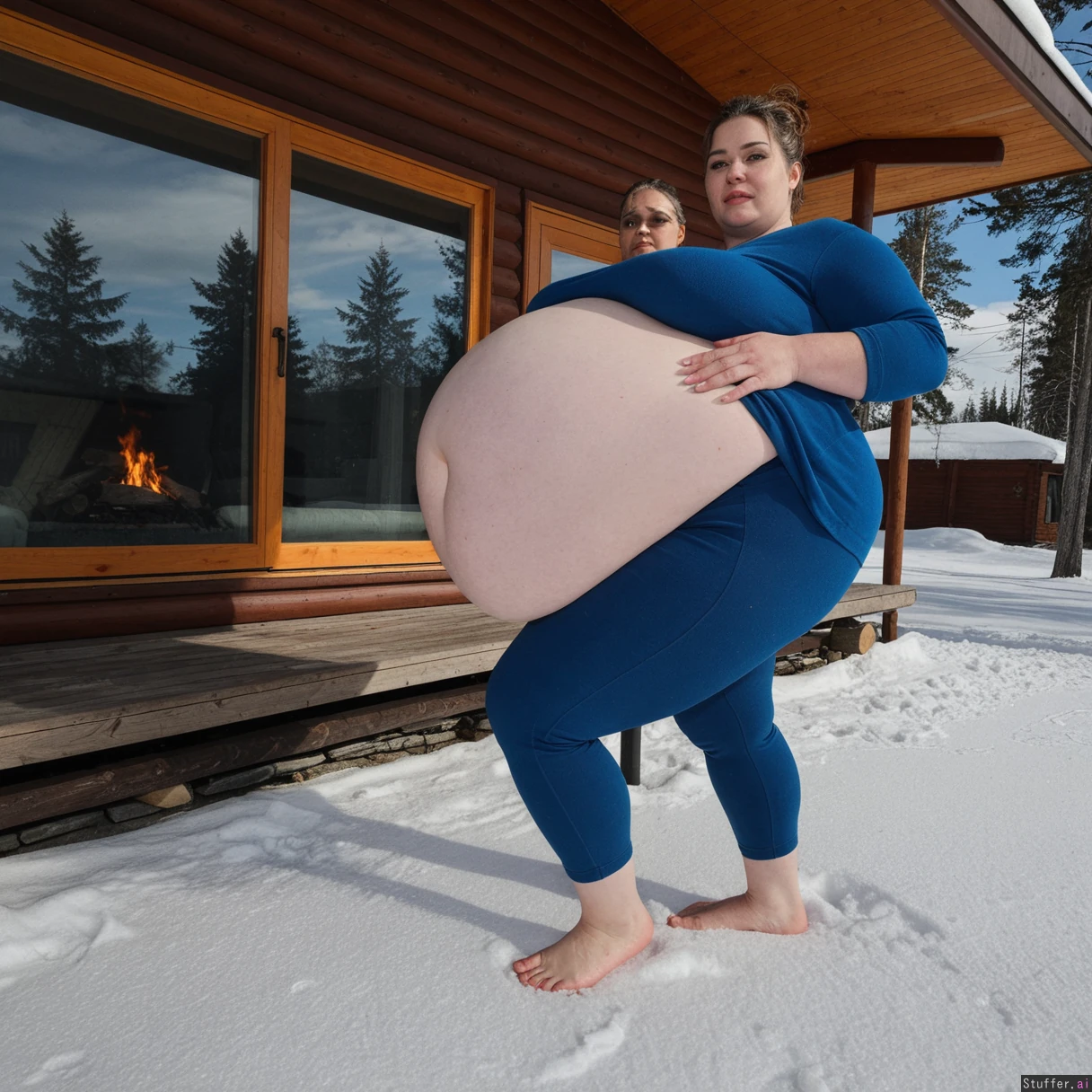 (A vintage portrait of subject walking casually under sun, snow effects, high contrast, cinematic set in Siberia style, emotional intensity), Extremely detailed ,(Middle aged hot milf, hot eyes,big_cheekbones,fat_lips,thick_eyebrows), (small tits,plump,bigass,fat arms, massive fat belly:1.1), ,(, looking desperately at viewer), (cinematic realistic universe:1.4),(feet, fullbody view :1.6), massive wooden modern glass house, fireplace, moody atmosphere, afternoon, lake,( gigantic belly :1.6),(wearing Siberia casual clothing outfit ,fully clothed:1.3).