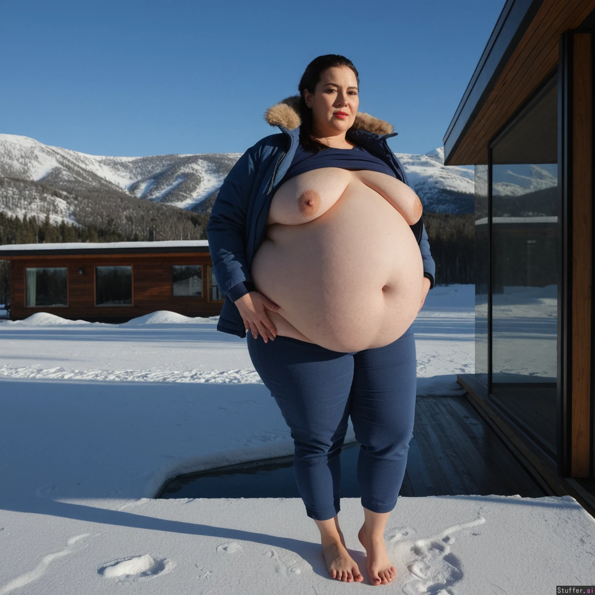 (A vintage portrait of subject walking casually under sun, snow effects, high contrast, cinematic set in Siberia style, emotional intensity), Extremely detailed ,(Middle aged hot milf, hot eyes,big_cheekbones,fat_lips,thick_eyebrows), (small tits,plump,bigass,fat arms, massive fat belly:1.1), ,(, looking desperately at viewer), (cinematic realistic universe:1.4),(feet, fullbody view :1.6), massive wooden modern glass house, fireplace, moody atmosphere, afternoon, lake,( gigantic belly :1.6),(wearing Siberia casual clothing outfit ,fully clothed:1.3).