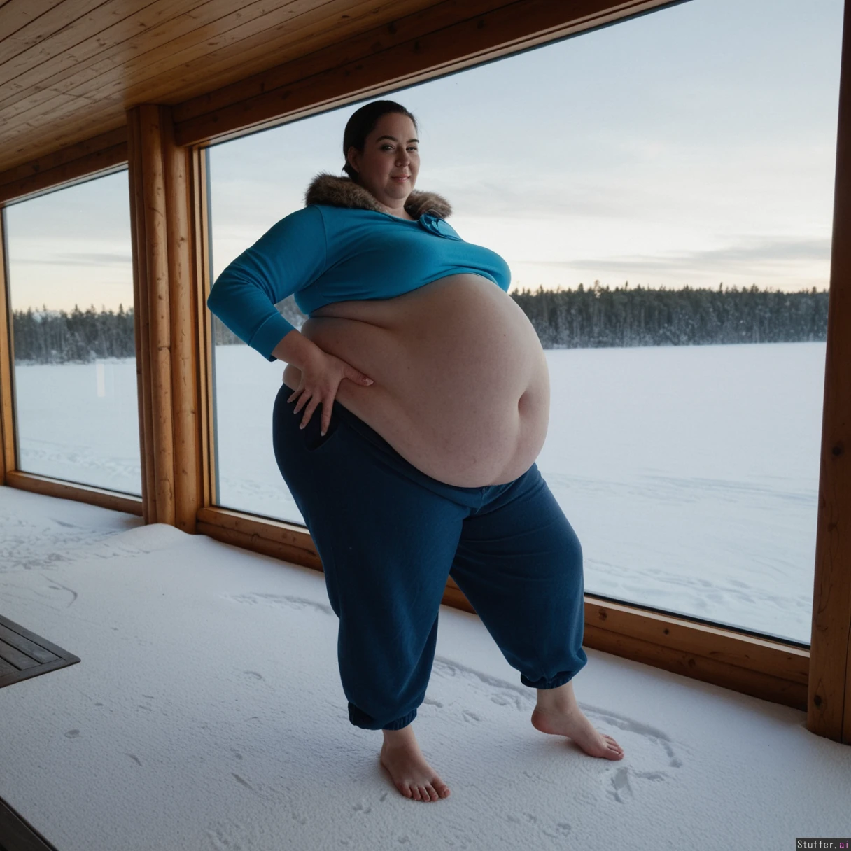 (A vintage portrait of subject walking casually under sun, snow effects, high contrast, cinematic set in Siberia style, emotional intensity), Extremely detailed ,(Middle aged hot milf, hot eyes,big_cheekbones,fat_lips,thick_eyebrows), (small tits,plump,bigass,fat arms, massive fat belly:1.1), ,(, looking desperately at viewer), (cinematic realistic universe:1.4),(feet, fullbody view :1.6), massive wooden modern glass house, fireplace, moody atmosphere, afternoon, lake,( gigantic belly :1.6),(wearing Siberia casual clothing outfit ,fully clothed:1.4).