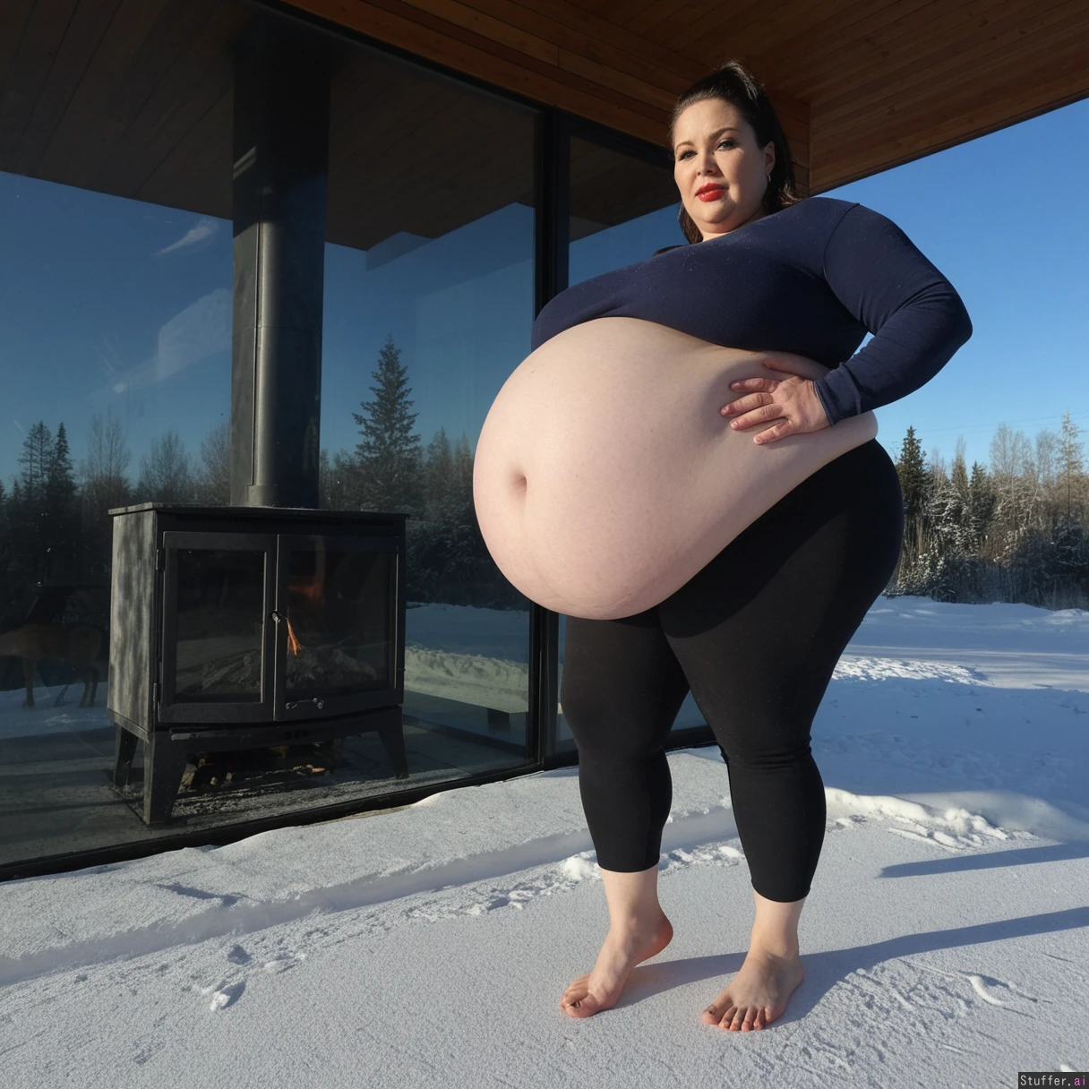 (A vintage portrait of subject walking casually under sun, snow effects, high contrast, cinematic set in Siberia style, emotional intensity), Extremely detailed ,(Middle aged hot milf, hot eyes,big_cheekbones,fat_lips,thick_eyebrows), (small tits,plump,bigass,fat arms, massive fat belly:1.1), ,(, looking desperately at viewer), (cinematic realistic universe:1.4),(feet, fullbody view :1.6), massive wooden modern glass house, fireplace, moody atmosphere, afternoon, lake,( gigantic belly :1.6),(wearing Siberia casual clothing outfit),(fully clothed:1.4).