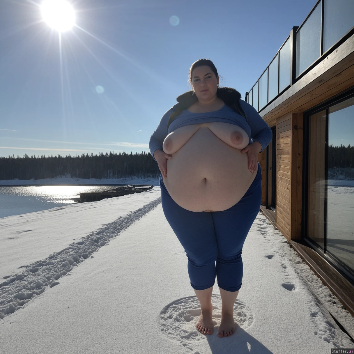 (A vintage portrait of subject walking casually under sun, snow effects, high contrast, cinematic set in Siberia style, emotional intensity), Extremely detailed ,(Middle aged hot milf, hot eyes,big_cheekbones,fat_lips,thick_eyebrows), (small tits,plump,bigass,fat arms, massive fat belly:1.1), ,(, looking desperately at viewer), (cinematic realistic universe:1.4),(feet, fullbody view :1.6), massive wooden modern glass house, fireplace, moody atmosphere, afternoon, lake,( gigantic belly :1.6),(wearing Siberia casual clothing outfit:1.4),(fully clothed:1.4).