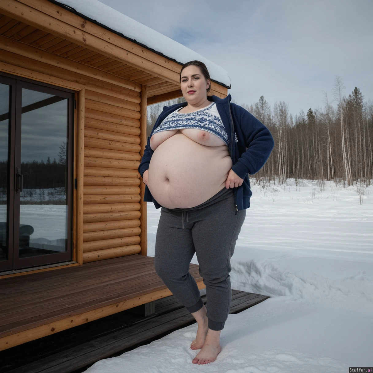 (A vintage portrait of subject walking casually under sun, snow effects, high contrast, cinematic set in Siberia style, emotional intensity), Extremely detailed ,(Middle aged hot milf, hot eyes,big_cheekbones,fat_lips,thick_eyebrows), (small tits,plump,bigass,fat arms, massive fat belly:1.1), ,(, looking desperately at viewer), (cinematic realistic universe:1.4),(feet, fullbody view :1.6), massive wooden modern glass house, fireplace, moody atmosphere, afternoon, lake,( gigantic belly :1.6),(wearing Siberia casual clothing outfit:1.6),(fully clothed:1.4).