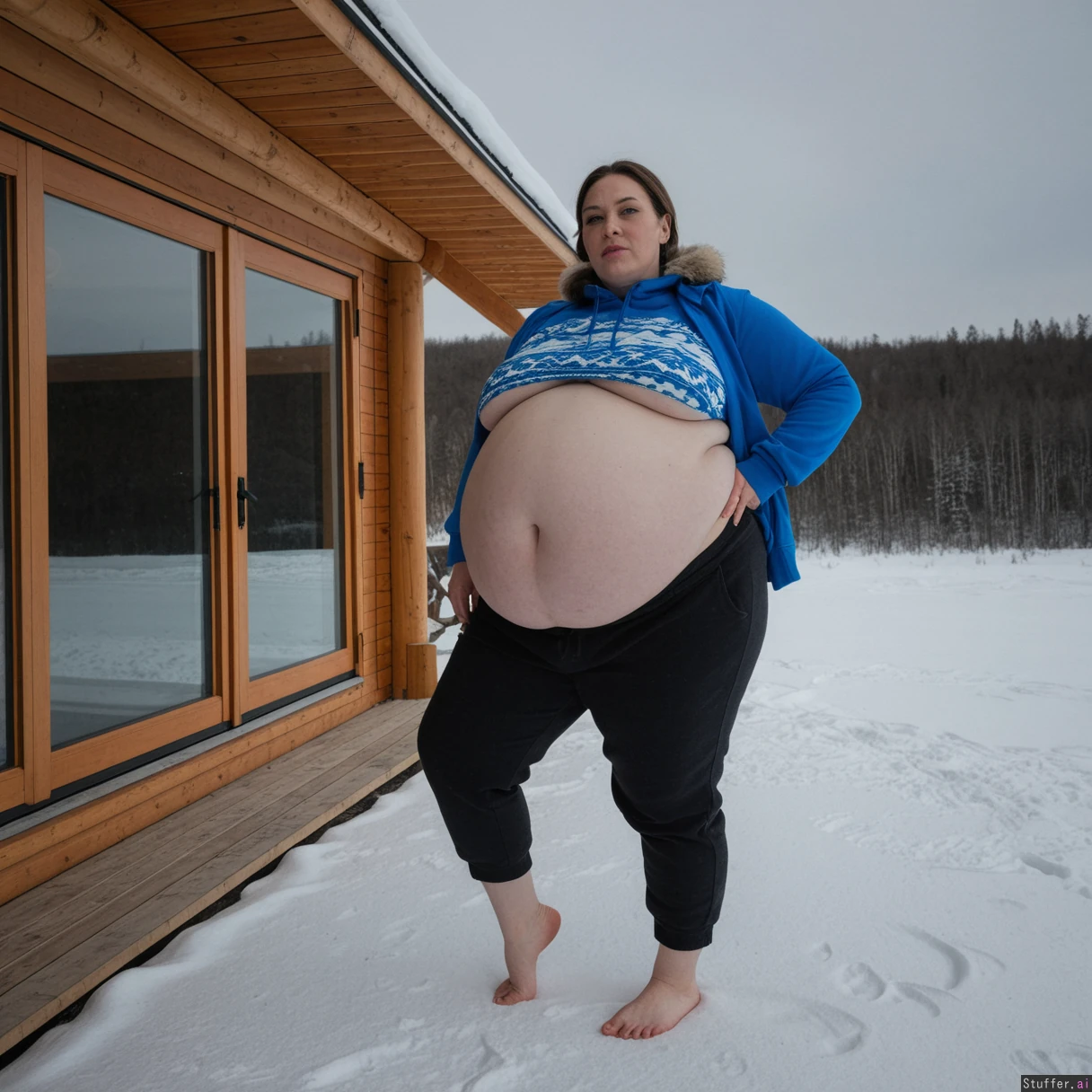 (A vintage portrait of subject walking casually under sun, snow effects, high contrast, cinematic set in Siberia style, emotional intensity), Extremely detailed ,(Middle aged hot milf, hot eyes,big_cheekbones,fat_lips,thick_eyebrows), (small tits,plump,bigass,fat arms, massive fat belly:1.1), ,(, looking desperately at viewer), (cinematic realistic universe:1.4),(feet, fullbody view :1.6), massive wooden modern glass house, fireplace, moody atmosphere, afternoon, lake,( gigantic belly :1.6),(wearing Siberia casual clothing outfit:1.6),(fully clothed:1.4).