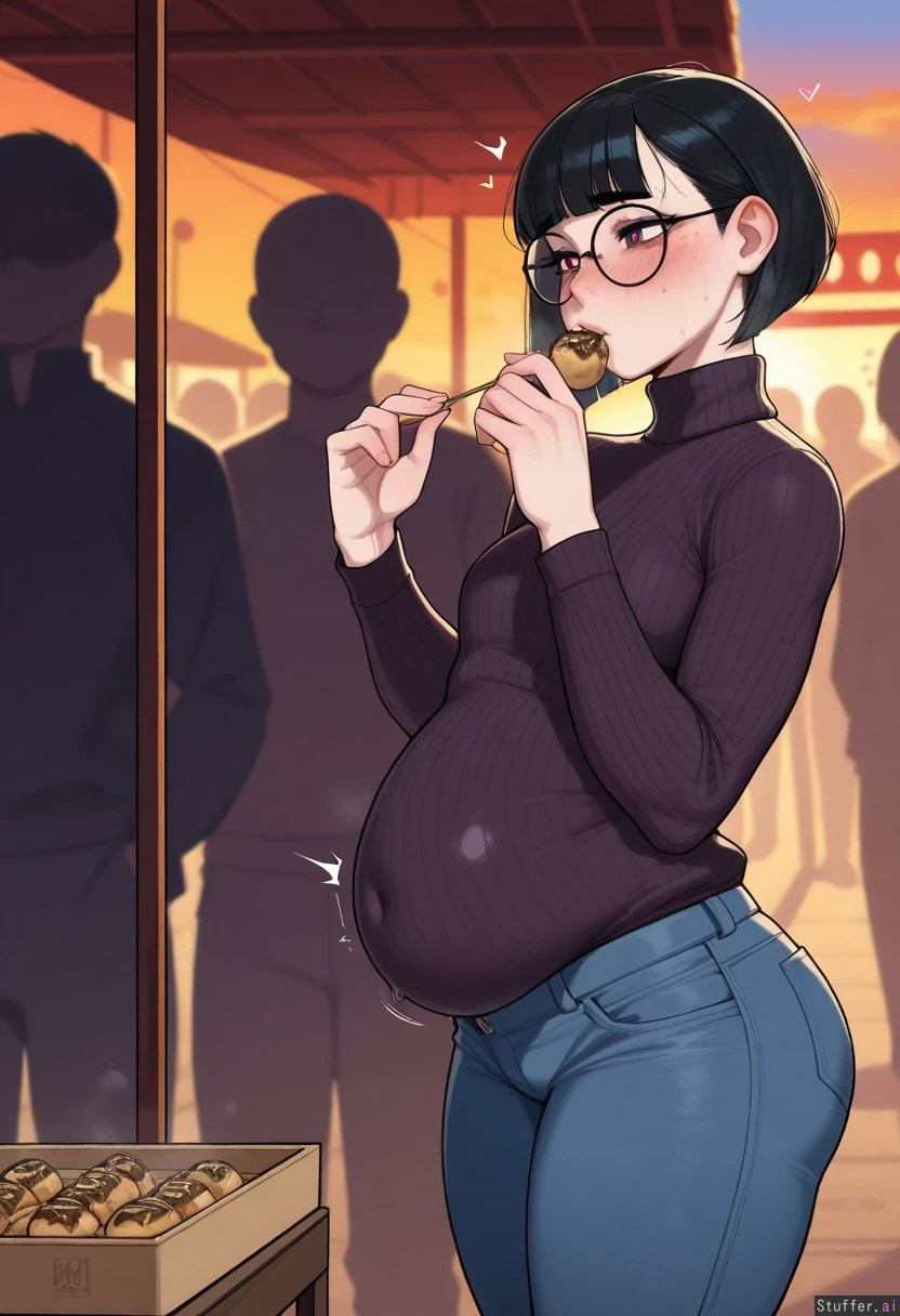 (highly detailed, best quality), (perfect anatomy, perfect proportions), (perfect lighting, warm lighting, vibrant colors, shadow, perfect shading), (beautiful face, beautiful eyes), (Krekkov(artist), KAMII MOMORU(artist)), (one girl, solo), (Japanese festival, sunset, crowd), (Asian girl, adult, mature), (short black hair, inverted bob hair, blunt bangs), (glowing purple eyes, large eyes, eyelashes, flared lashes), (pale skin, shiny skin, ((freckles, mole under eye, body freckles))), ((black turtleneck sweater, dark blue jeans, covered stomach, glasses)), (((((blushing, sweating))))), ((aroused, heart pupils, hearts around head, entranced, pleasure)), (slim, curvy, toned body), (round face), (flat chested:0.95), (narrow waist), (soft belly, full belly, bloated belly, round belly, bulging belly), (soft hips), (soft thighs), ((standing, eating takoyaki, mouth open, side view))