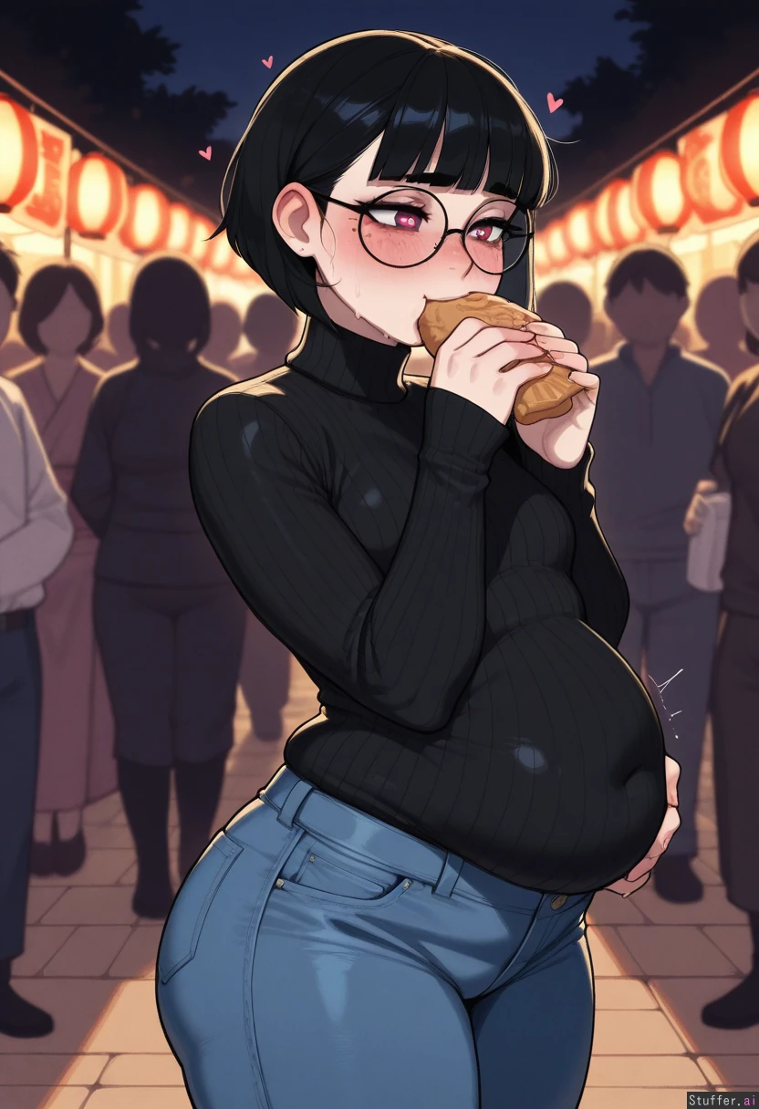 (highly detailed, best quality), (perfect anatomy, perfect proportions), (perfect lighting, warm lighting, vibrant colors, shadow, perfect shading), (beautiful face, beautiful eyes), (Krekkov(artist), KAMII MOMORU(artist)), (one girl, solo), (Japanese festival, night, crowd), (Asian girl, adult, mature), (short black hair, inverted bob hair, blunt bangs), (glowing purple eyes, large eyes, eyelashes, flared lashes), (pale skin, shiny skin, ((freckles, mole under eye, body freckles))), ((black turtleneck sweater, dark blue jeans, covered stomach, glasses)), (((((blushing, sweating))))), ((aroused, heart pupils, hearts around head, entranced, pleasure)), (slim, curvy, toned body), (round face), (flat chested:0.95), (narrow waist), (soft belly, full belly, bloated belly, round belly, bulging belly, protruding belly), (soft hips), (soft thighs), ((standing, eating taiyaki, mouth open, side view))
