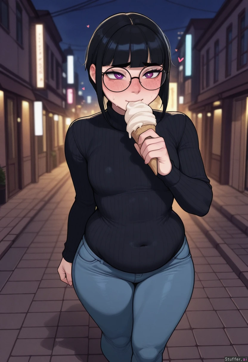 (highly detailed, best quality), (perfect anatomy, perfect proportions), (perfect lighting, warm lighting, vibrant colors, shadow, perfect shading), (beautiful face, beautiful eyes), (Krekkov(artist), KAMII MOMORU(artist)), (one girl, solo), (city street, night), (Asian girl, adult, mature), (short black hair, inverted bob hair, blunt bangs), (glowing purple eyes, large eyes, eyelashes, flared lashes), (pale skin, shiny skin, ((freckles, mole under eye, body freckles))), ((black turtleneck sweater, dark blue jeans, covered stomach, glasses)), (((((blushing, sweating))))), ((aroused, heart pupils, hearts around head, entranced, pleasure)), (slim, curvy, toned body), (round face), (flat chested:0.95), (narrow waist), (soft belly, full belly, bloated belly, round belly, bulging belly, protruding belly), (soft hips), (soft thighs), ((walking, eating ice cream))