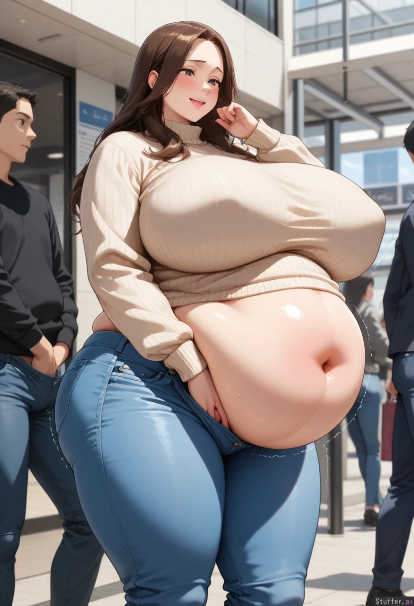absurdres, 8k, perfect anatomy, masterpiece, beautiful face, beautiful eyes, (((1girl))) (((milf)), ((long hair)), ((((standing up, public, fully clothed, jeans, sweater, hand in pants, fingering_partner)))) ((chubby)), ((chubby belly, huge belly:1.5, stuffed belly, huge breasts)), thick thighs ((deep blush)), (bitch, lustful, happy), ((trembling)), ((quivering)), (Tall girl), (Beautiful girl) (((gigantic belly:1.3))), ((super-soft belly:1.5), belly overflow:1.2)), (((love handles:1.5))) ((Shiny skin)), ((skindentation)), ((plump), slim face, ((deep navel)) (((sweat:1.1))