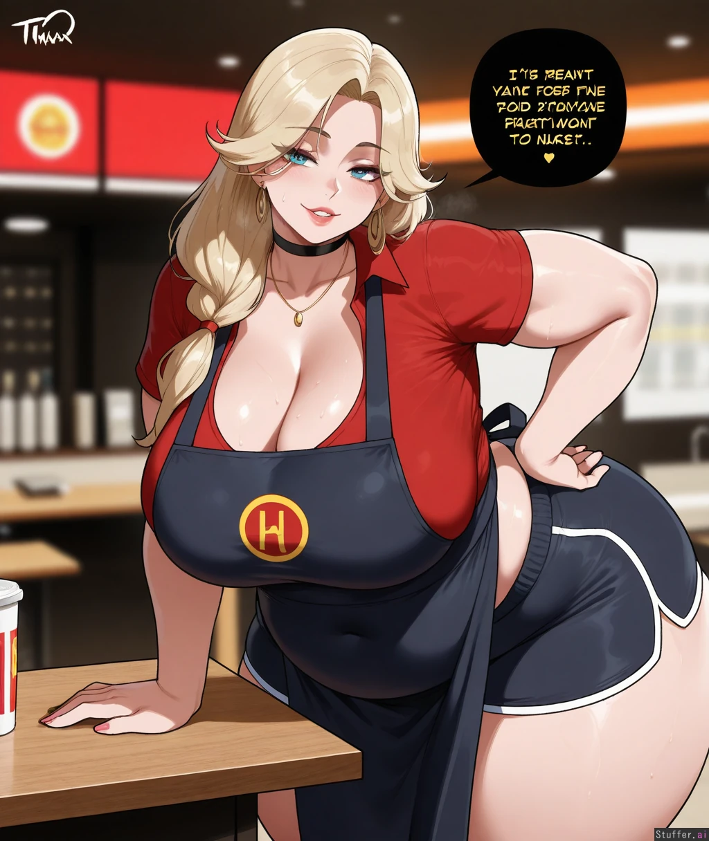 ((Solo, 1 woman)), ((nyantcha)))), (krekkov), c.cu(artist), araneesama(artist), 8k, high resolution, gorgeous, masterpiece, ((flawless)), (((high rating))), ((highly detailed face)), beautiful face, ((((fat female)))), ((((thick girl)))), (((steamy))), (((skindentation))), ((())), ((())), ((((solo_female)))), (()), ((((Fast food worker)))), (((long straight blonde hair tied back))), ((Cleavage)), (((Red polo shirt, black shorts, black apron, jewelry)), (()), (((Morbidly obese:1.2))), ((big breasts)), ((massive thighs)), ((wide hips)), fat arms, ((voluptuous)), ((huge fat ass)), sweaty, (((Sexy, seductive))), ((((())))), in fast food restaurant, looking at viewer,