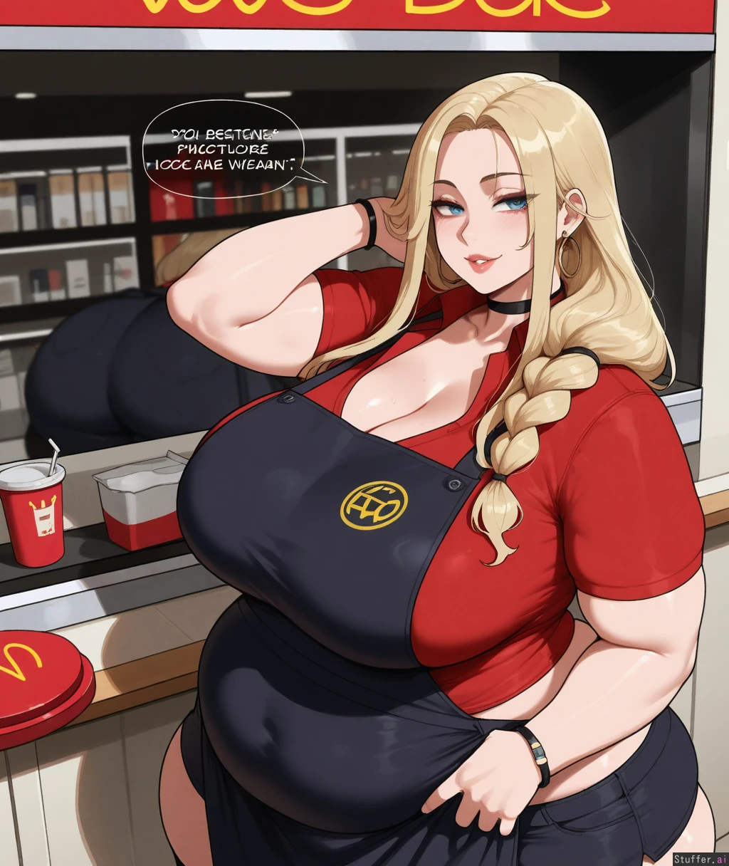 ((Solo, 1 woman)), ((nyantcha)))), (krekkov), c.cu(artist), araneesama(artist), 8k, high resolution, gorgeous, masterpiece, ((flawless)), (((high rating))), ((highly detailed face)), beautiful face, ((((fat female)))), ((((thick girl)))), (((steamy))), (((skindentation))), ((())), ((())), ((((solo_female)))), (()), ((((Fast food worker)))), (((long straight blonde hair tied back))), ((Cleavage)), (((Red polo shirt, black shorts, black apron, jewelry)), ((fully clothed)), (((Morbidly obese:1.3))), ((big breasts)), ((massive thighs)), ((wide hips)), fat arms, ((voluptuous)), ((huge fat ass)), sweaty, (((Sexy, seductive))), ((((())))), in fast food restaurant, looking at viewer,