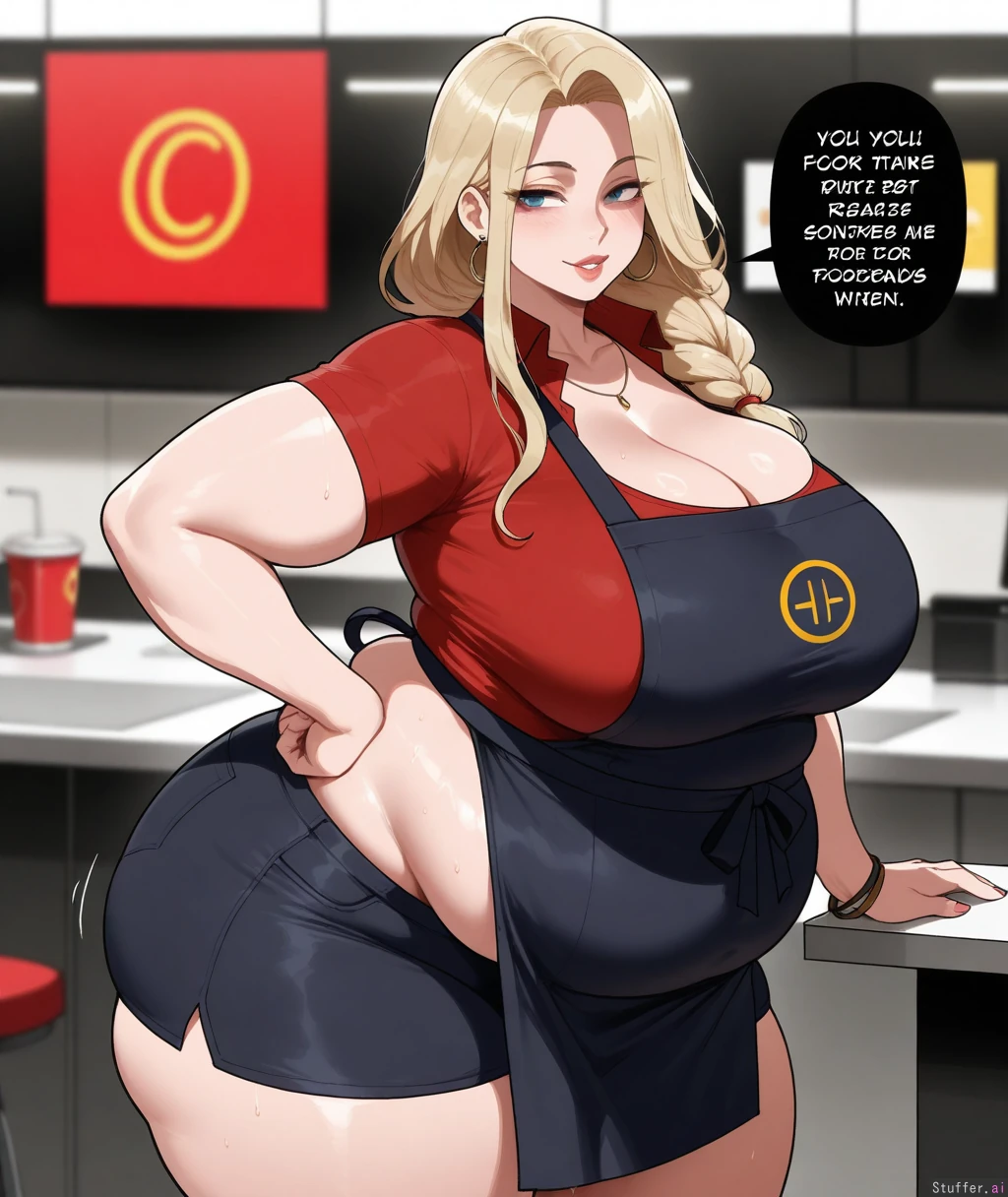 ((Solo, 1 woman)), ((nyantcha)))), (krekkov), c.cu(artist), araneesama(artist), 8k, high resolution, gorgeous, masterpiece, ((flawless)), (((high rating))), ((highly detailed face)), beautiful face, ((((fat female)))), ((((thick girl)))), (((steamy))), (((skindentation))), ((())), ((())), ((((solo_female)))), (()), ((((Fast food worker)))), (((long straight blonde hair tied back))), ((Cleavage)), (((Red polo shirt, black shorts, black apron, jewelry)), ((fully clothed)), (((Morbidly obese:1.3))), ((big breasts)), ((massive thighs)), ((wide hips)), fat arms, ((voluptuous)), ((huge fat ass)), sweaty, (((Sexy, seductive))), ((((())))), in fast food restaurant, looking at viewer, leaning forward,