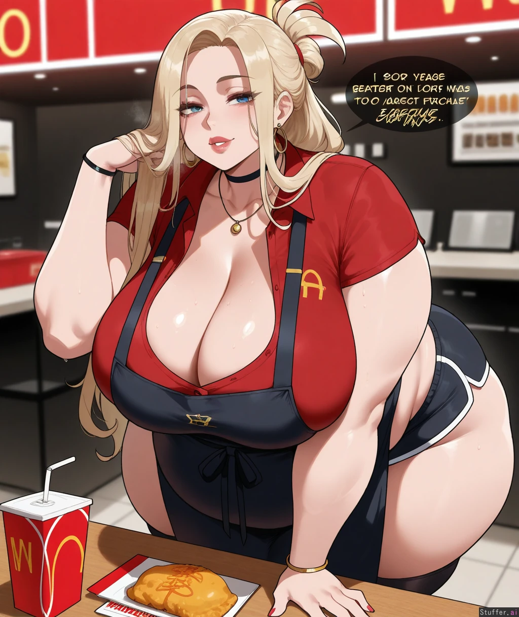 ((Solo, 1 woman)), ((nyantcha)))), (krekkov), c.cu(artist), araneesama(artist), 8k, high resolution, gorgeous, masterpiece, ((flawless)), (((high rating))), ((highly detailed face)), beautiful face, ((((fat female)))), ((((thick girl)))), (((steamy))), (((skindentation))), ((())), ((())), ((((solo_female)))), (()), ((((Fast food worker)))), (((long straight blonde hair tied back))), ((Cleavage)), (((Red polo shirt, black shorts, black apron, jewelry)), ((fully clothed)), (((Morbidly obese:1.4))), ((big breasts)), ((massive thighs)), ((wide hips)), fat arms, ((voluptuous)), ((huge fat ass)), sweaty, (((Sexy, seductive))), ((((())))), in fast food restaurant, looking at viewer, leaning forward,