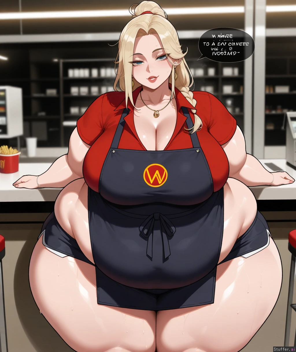 ((Solo, 1 woman)), ((nyantcha)))), (krekkov), c.cu(artist), araneesama(artist), 8k, high resolution, gorgeous, masterpiece, ((flawless)), (((high rating))), ((highly detailed face)), beautiful face, ((((fat female)))), ((((thick girl)))), (((steamy))), (((skindentation))), ((())), ((())), ((((solo_female)))), (()), ((((Fast food worker)))), (((long straight blonde hair tied back))), ((Cleavage)), (((Red polo shirt, black shorts, black apron, jewelry)), ((fully clothed)), (((Morbidly obese:1.4))), ((big breasts)), ((massive thighs)), ((wide hips)), fat arms, ((voluptuous)), ((huge fat ass)), sweaty, (((Sexy, seductive))), ((((())))), in fast food restaurant, looking at viewer, leaning forward,