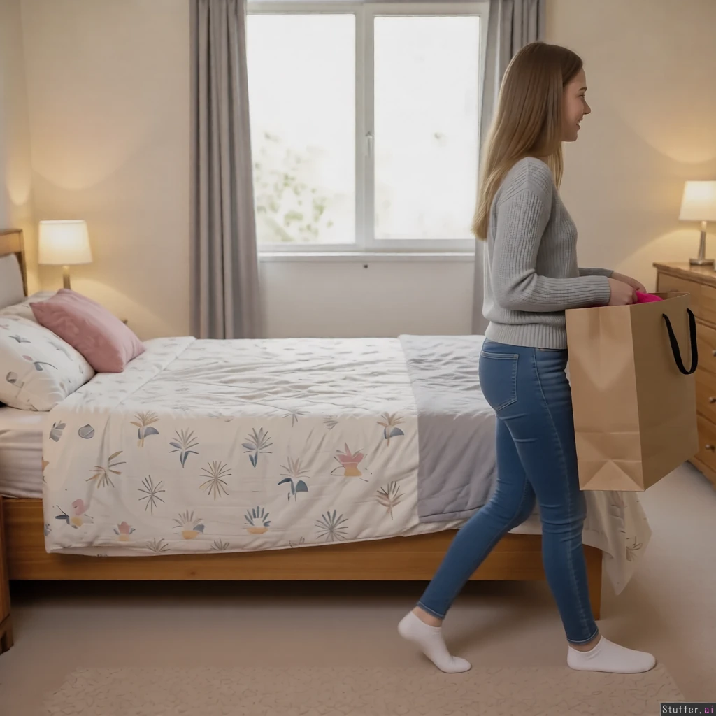 Make the girl with the bag walk to the right side of the image.