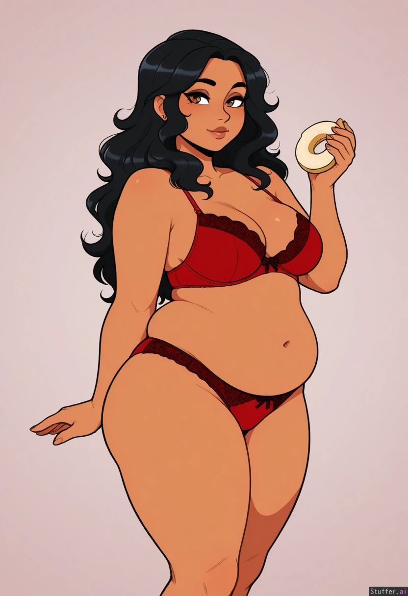 Scruffyturtles(artist), pudgeruffian(artist), masterpiece, hyper resolution, hyper realistic, best quality, high rating, flat colors, solo, (Latina), ((Long wavy black hair)), (brown eyes), (brown skin), (wingtip eyeliner), (red lingerie), medium breasts, (Standing), (neutral background), (Overweight:1.35), (chubby cheeks:0.75), (Potbelly:0.00), ((Holding a donut:0.0)), ((Rubbing_belly:0.0)), ((Bloated:0.0)), ((Surprised_expression:0.0)), ((Curvy:0.0)),