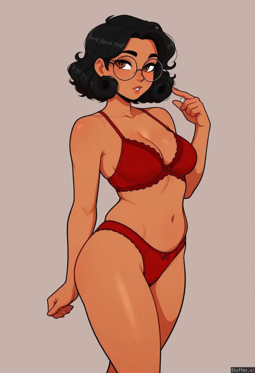 Scruffyturtles(artist), pudgeruffian(artist), masterpiece, hyper resolution, hyper realistic, best quality, high rating, flat colors, solo, ((curly black hair)), (brown eyes), (dark brown skin), (wingtip eyeliner), (red lingerie), (round glasses), medium breasts, (Standing), (neutral background), (Overweight:0.85), (chubby cheeks:0.75), (Potbelly:0.00), ((Holding a donut:0.0)), ((Rubbing_belly:0.0)), ((Bloated:0.0)), ((Surprised_expression:0.0)), ((Curvy:0.0)),
