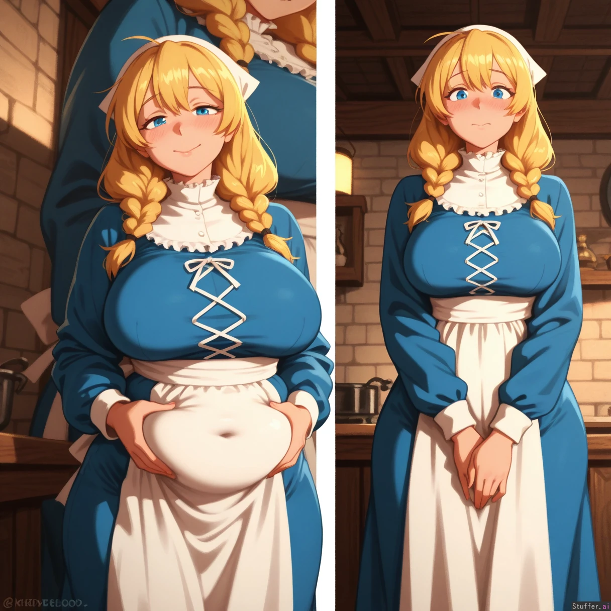 absurdres, 8k, perfect anatomy, cute, masterpiece, beautiful face, beautiful eyes, simple lighting, khyle. , noodlenood , colo, gardegu, (tall female:1.1), 1girl, solo, mature, Blonde hair, blue eyes, braided pigtails, double ponytails, long hair, white bandanna , blue dress, frilled collar , medieval kitchen, round big fat belly on narrow waist, plump curves, plump, unbelievably erotic soft fattened hanging belly, modest clothing, low-angle_view, weight_conscious, looking at viewer blushing, embarrassed, ashamed, (saying to husband "I know I gained weight... am I still pretty?") ,((close up side views of her belly and waist)),