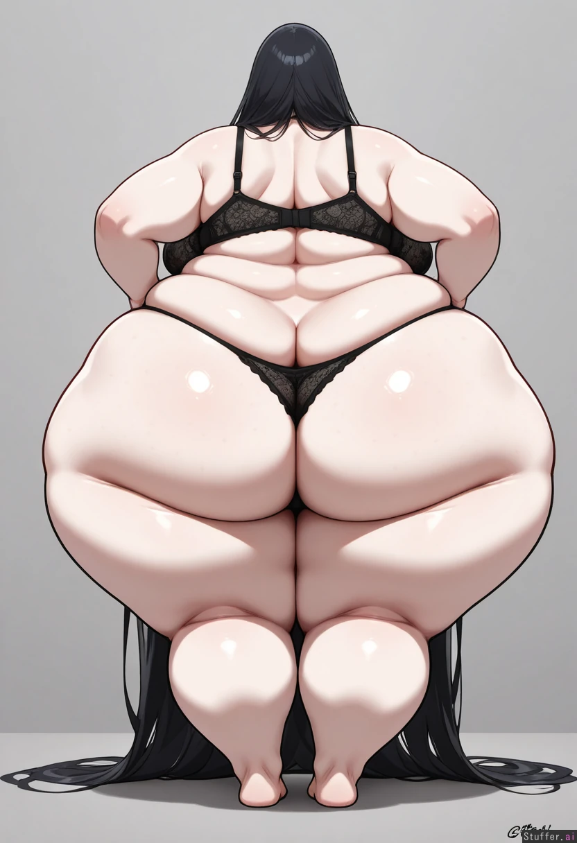 ((goth girl)), (pale skin, dark makeup, black lipstick, very pale skin), (detailed skin texture), 28, thick thighs, (hyper hips), plump face, wearing black lace bra and thong, long flowing dark hair, (massive thighs, huge hips, incredibly wide hips, hyper thighs), (Fat rolls, dimpled fat, flabby, soft fat, heavy sagging flab), (flabby, deep navel), ((soft flab, cellulite, dimples and wrinkles)), weight gain, feedee, ssbbw ((thicc, phat)), ((pawg)), (huge ass, ridiculously fat ass, huge flabby dimpled cellulite covered ass, sagging ass, extremely wide hips, hips wider than shoulders, incredibly thick thighs, hyper wide hips), ((pear shaped, bottom-heavy, fat lower body, very flabby legs and thighs, absurdly wide hips, gorgeous woman)), ((incredibly obese woman, very fat woman with impossibly wide hips, exaggerated Bottomheavy body)),